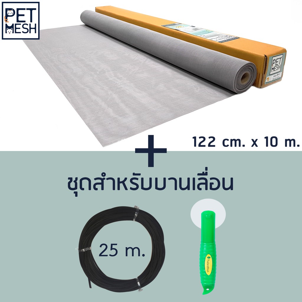Pet Mesh Set สำหรับบานเลื่อน (122cm. x 10m.) มุ้งลวดทนสัตว์เลี้ยง+ลุกกลิ้ง + ยางอัด 25m.**สีเทา**