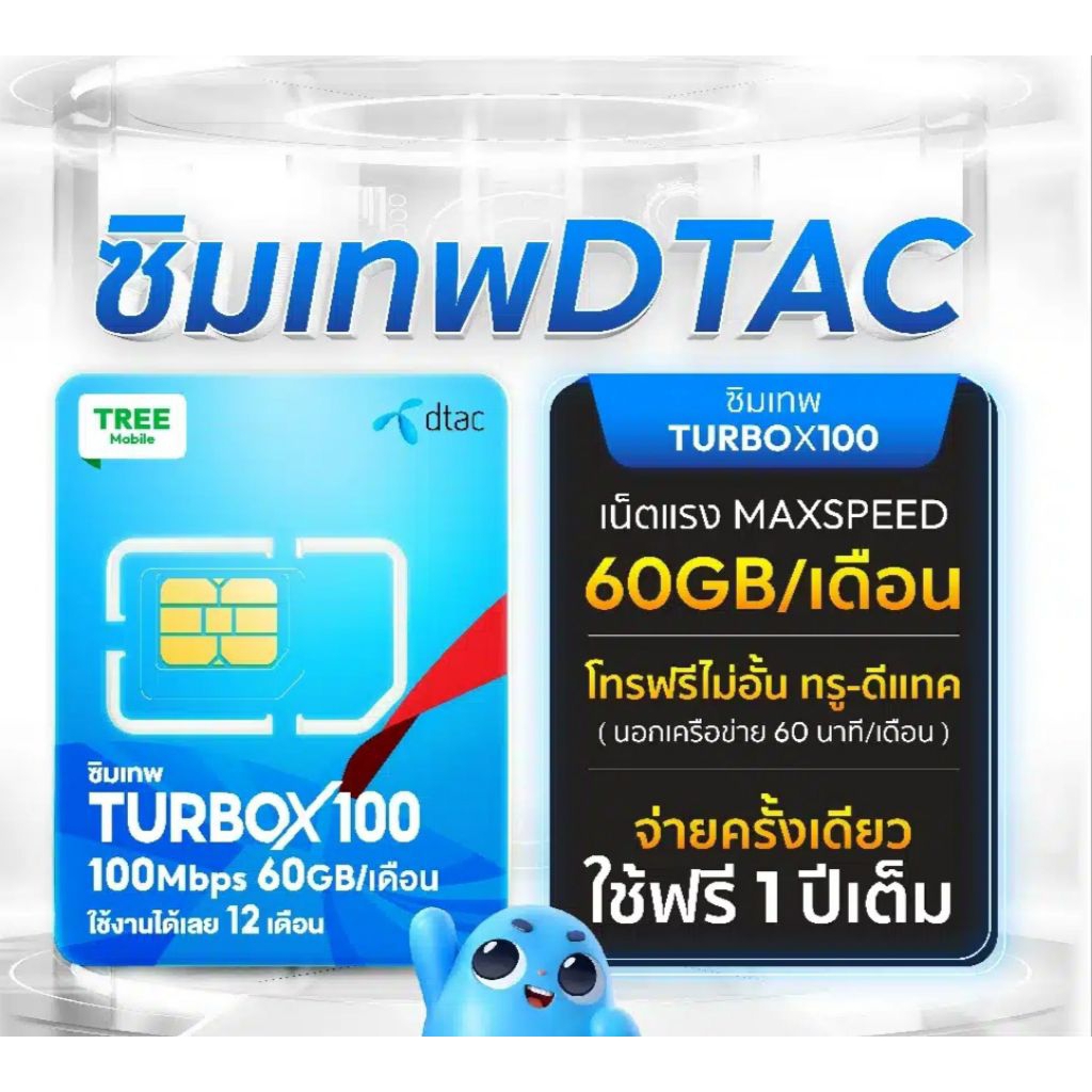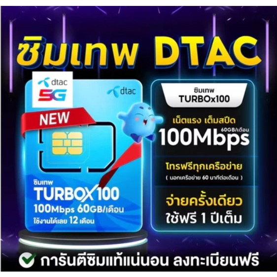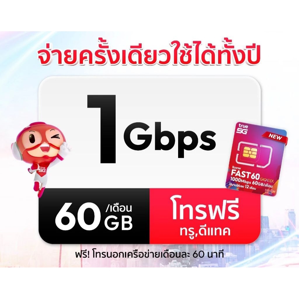 ซิมเทพทรู Fast60 ซิมเน็ตรายปี DTAC TURBOx100 เน็ตเร็วเต็มสปีด 60 GB/เดือน +โทรฟรี หมดอายุ 30/10/2569