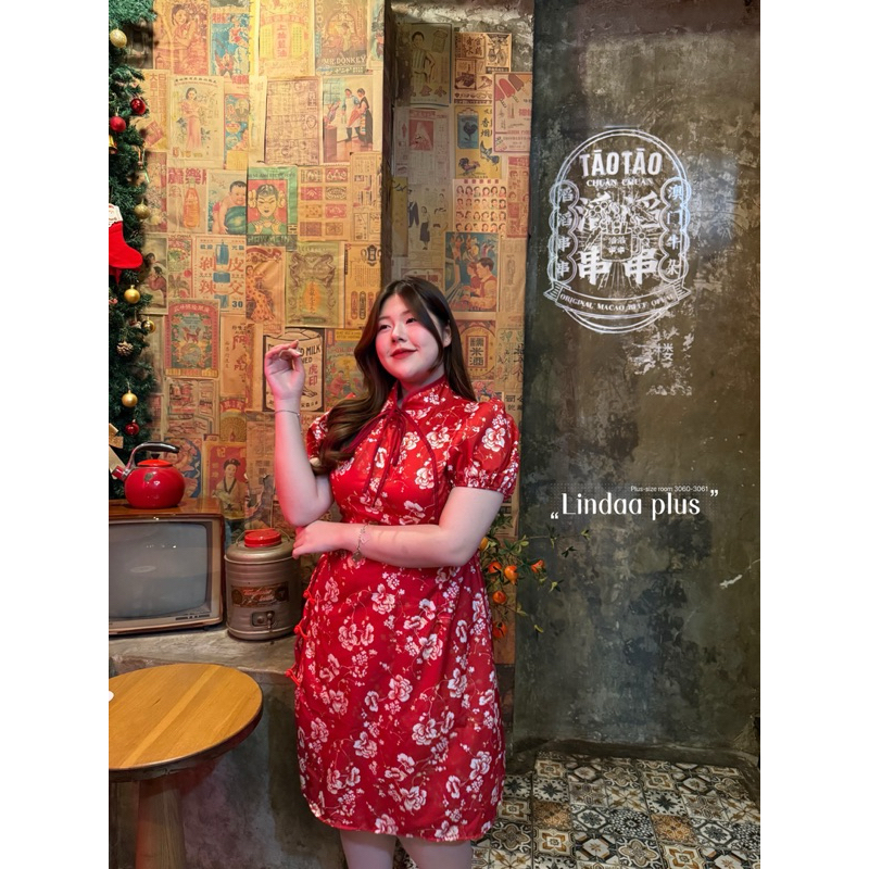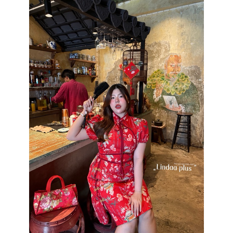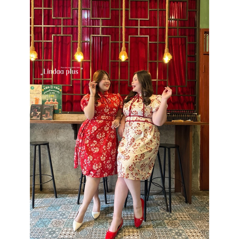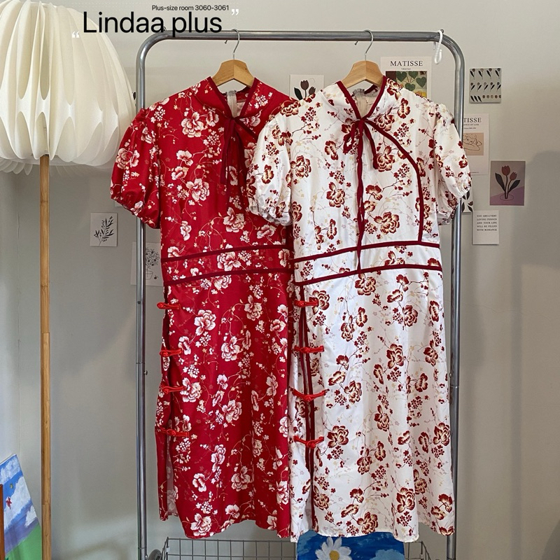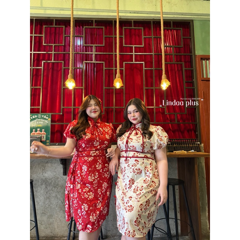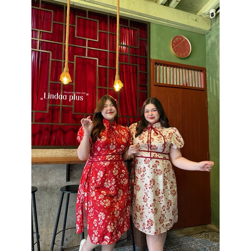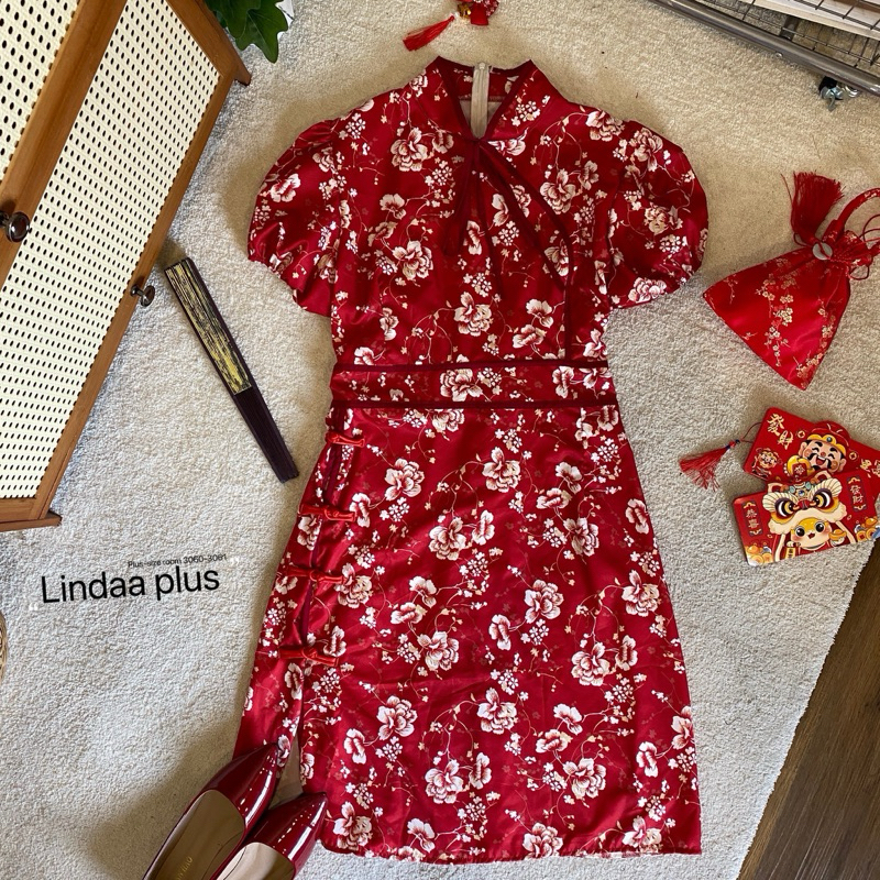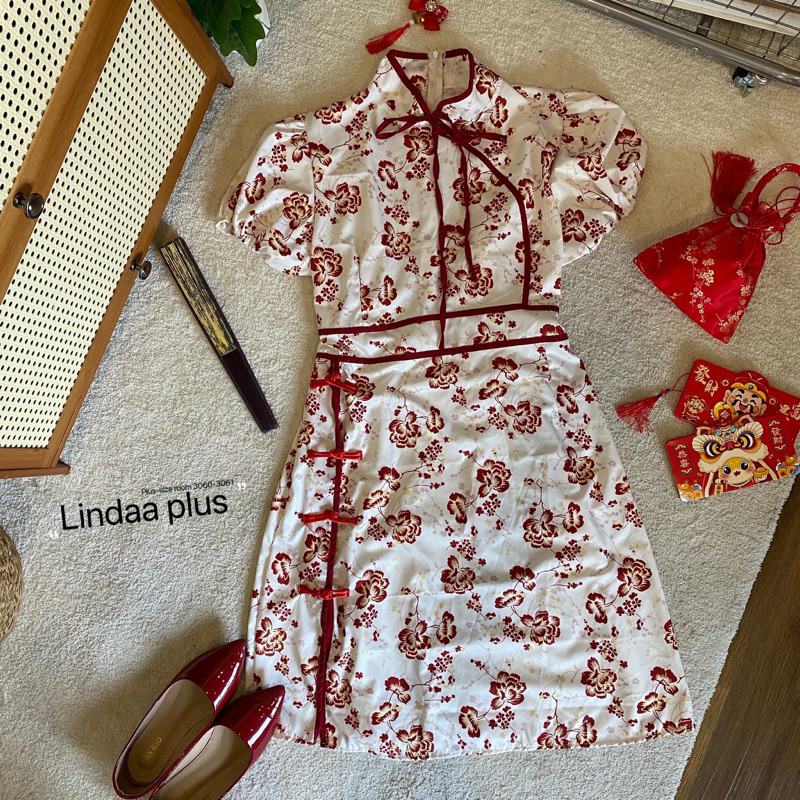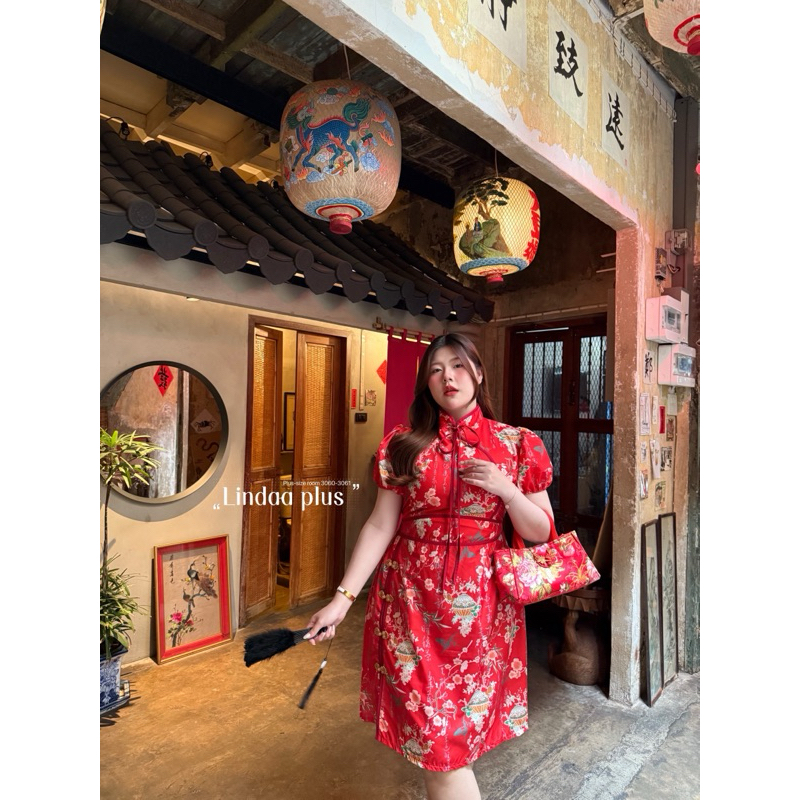 (พร้อมส่ง/ส่งด่วน!✨) Jin Long Dress🏮🧧🪭เดรสกี่เพ้าตรุษจีนลายดอกไม้ผูกโบว์แขนตุ๊กตาสาวอวบไซส์ใหญ่ (อกหน้าผ้ายืด-52)