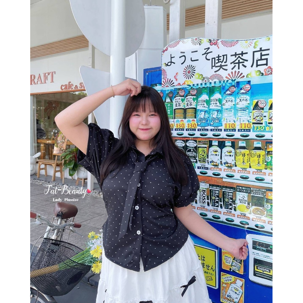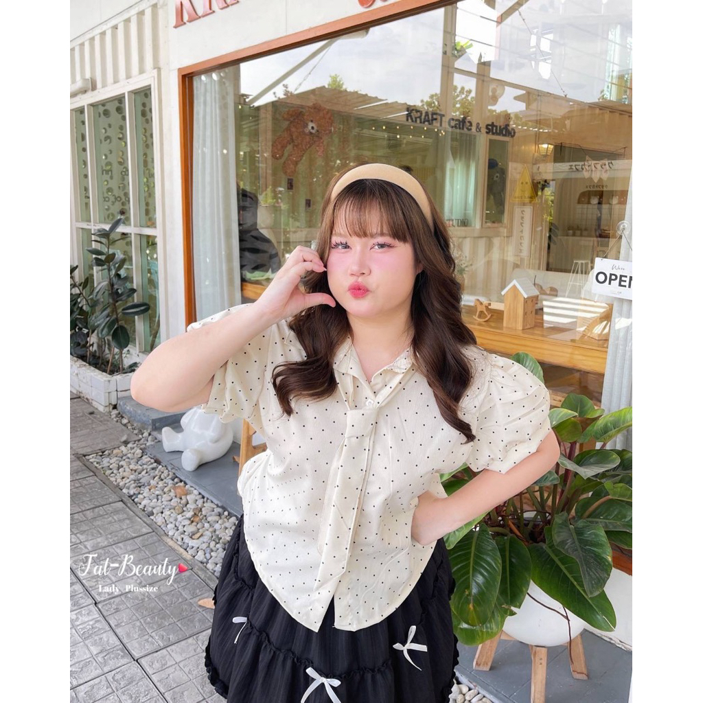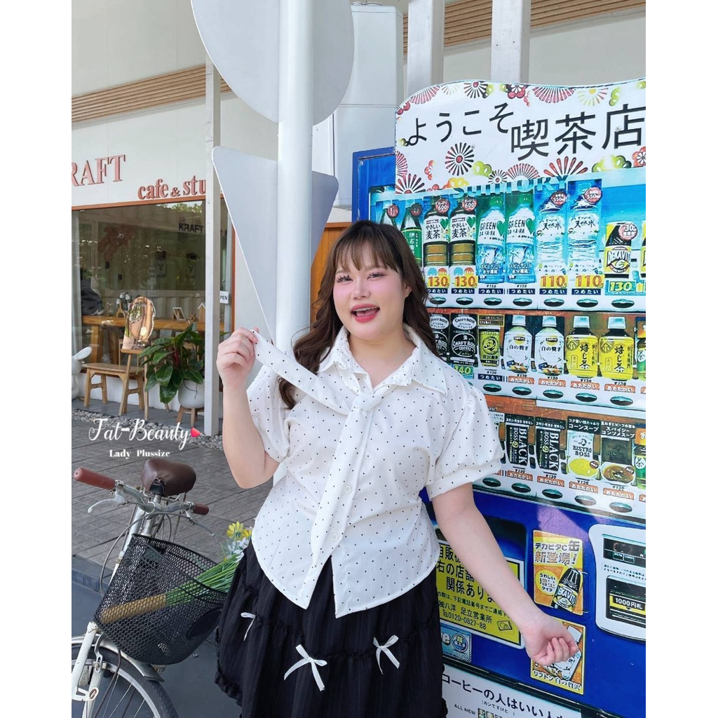 (ถูกสุด/ส่งด่วน!⚡️) A137(FB) เสื้อเชิ้ตแขนตุ๊กตาลายจุดโพกาดอท แต่งกระดุมดอกไม้ผ้าครัชพิมพ์ลาย มีเนคไทด์ผูกสาวอวบไซส์ใหญ่