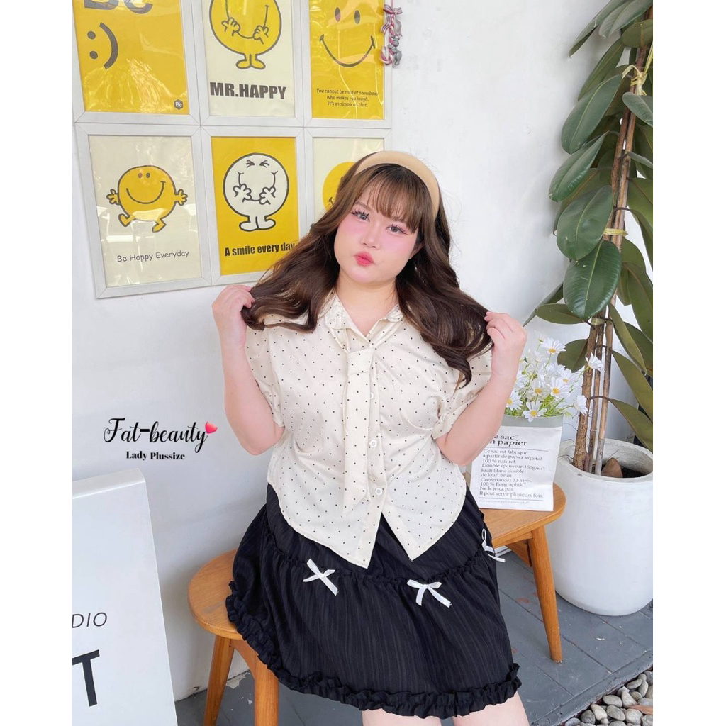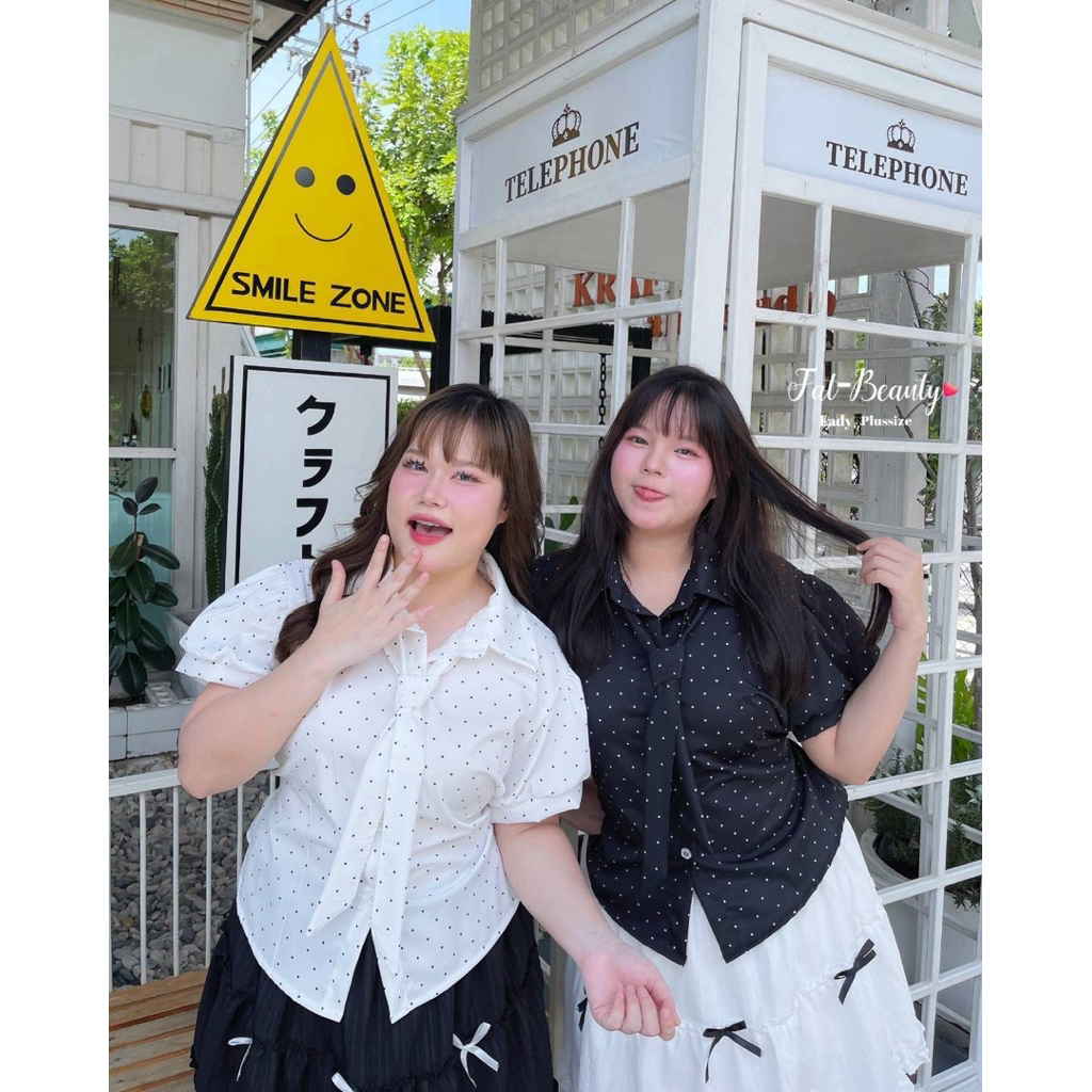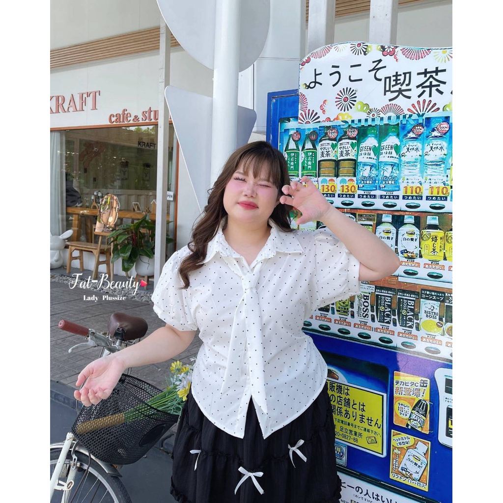 (ถูกสุด/ส่งด่วน!⚡️) A137(FB) เสื้อเชิ้ตแขนตุ๊กตาลายจุดโพกาดอท แต่งกระดุมดอกไม้ผ้าครัชพิมพ์ลาย มีเนคไทด์ผูกสาวอวบไซส์ใหญ่