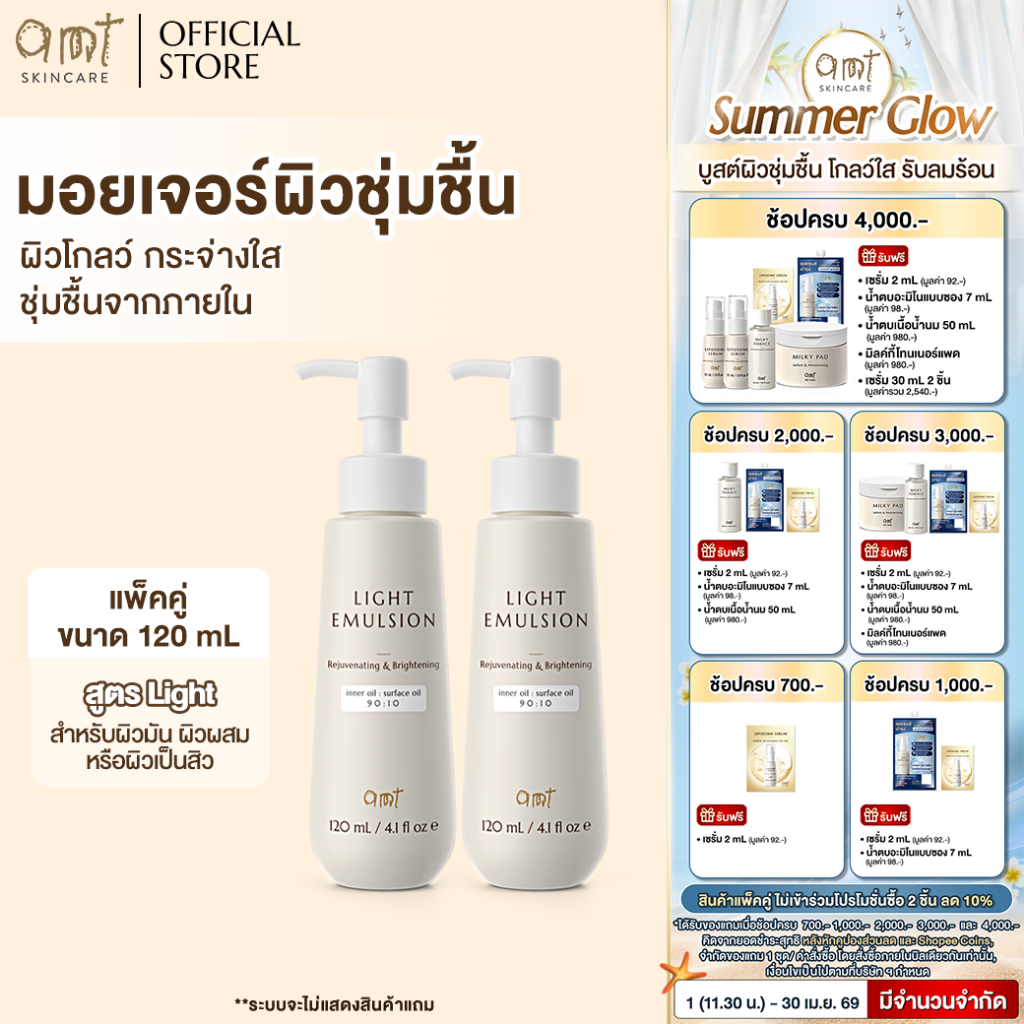 [แพ็คคู่] AMT Light Emulsion 120 mL - มอยเจอร์ไรเซอร์เติมความชุ่มชื้น ผิวโกลว์ นุ่ม เฟิร์ม สำหรับผิวมัน ผิวผสม ผิวเป็นสิ