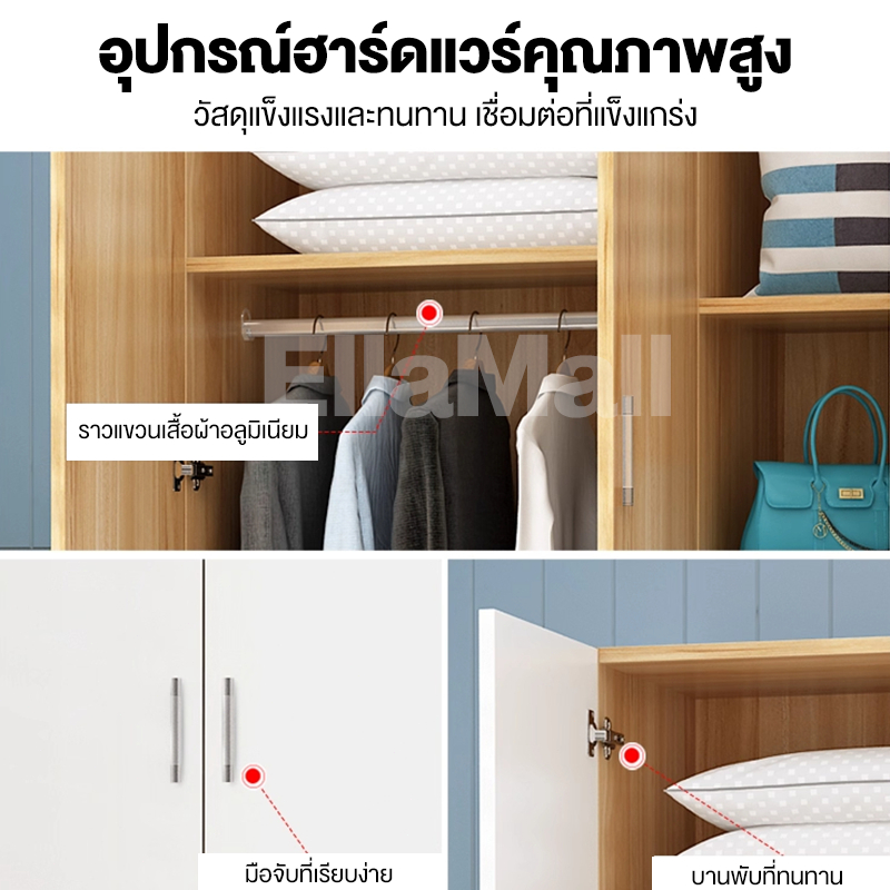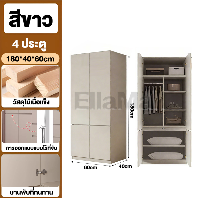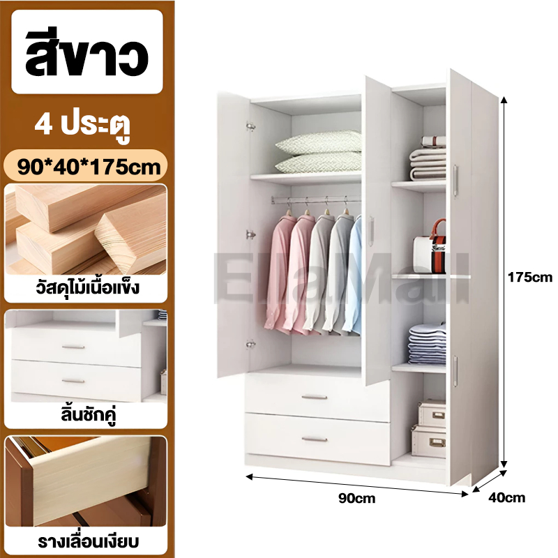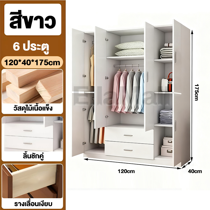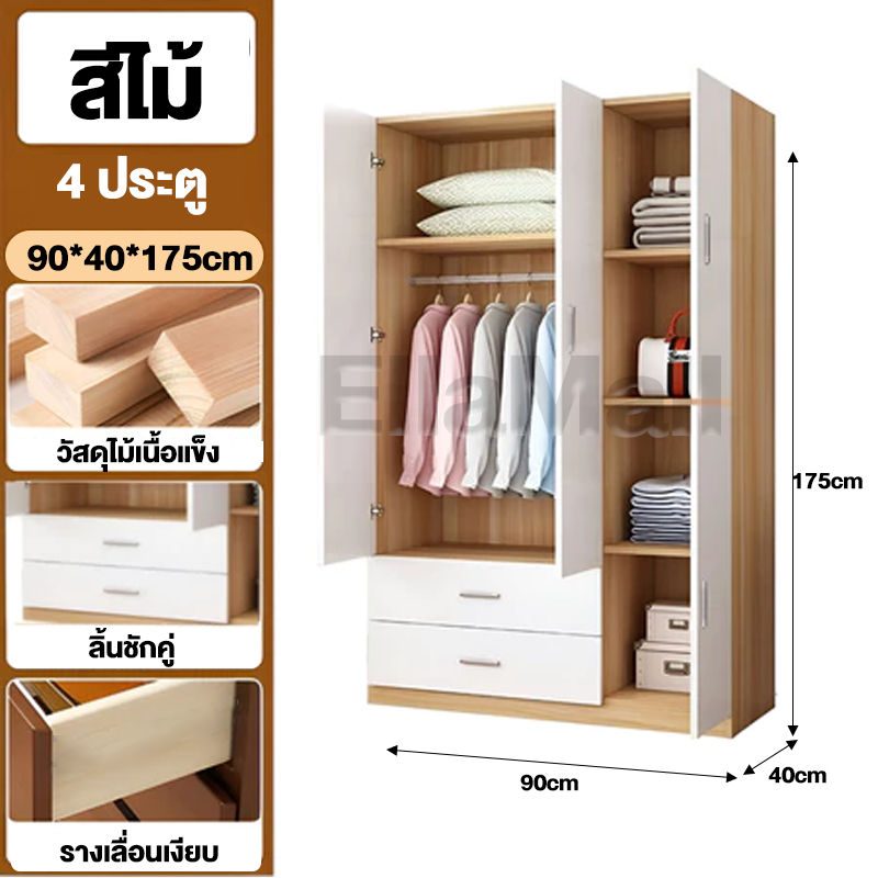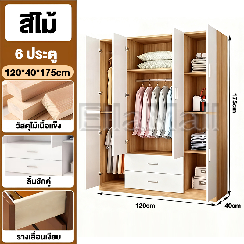 EM ตู้เสื้อผ้าใหญ่ ตู้เก็บเสื้อผ้า เก็บเสื้อผ้าได้มาก หลายชั้น แขวนเสื้อได้ ประกอบง่าย ไม้เนื้อแข็ง ส่งฟรี Wardrobe