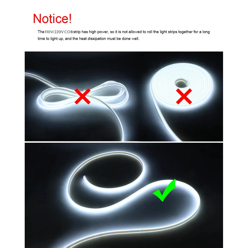 10M 5M 3M COB LED Light Strip 220V IP65 กันน้ําไดโอดเทป 288LED/M สูง Lumen หลอดนีออนเทปโคมไฟห้องครัวตู้เสื้อผ้า Backlight