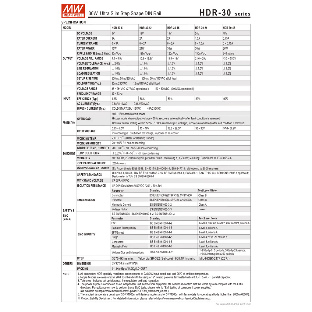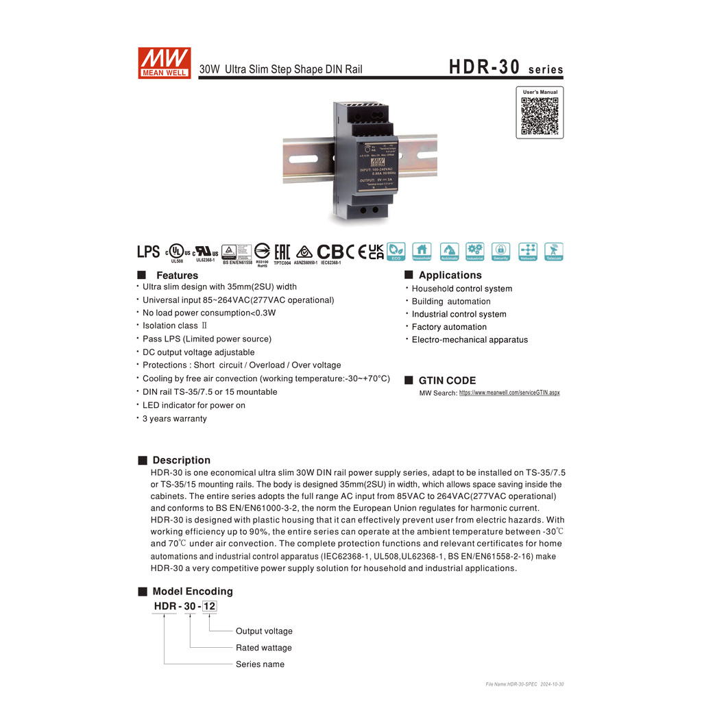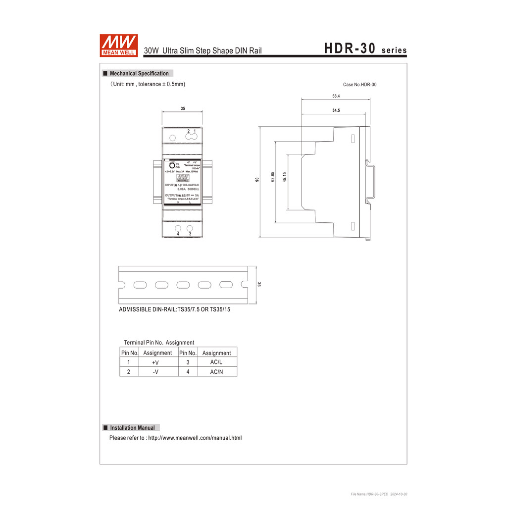 HDR-30-24 | MEAN WELL DIN Rail Switching Power Supply 24V 1.5A 36W รับประกัน 3 ปี ออกใบกำกับภาษีได้