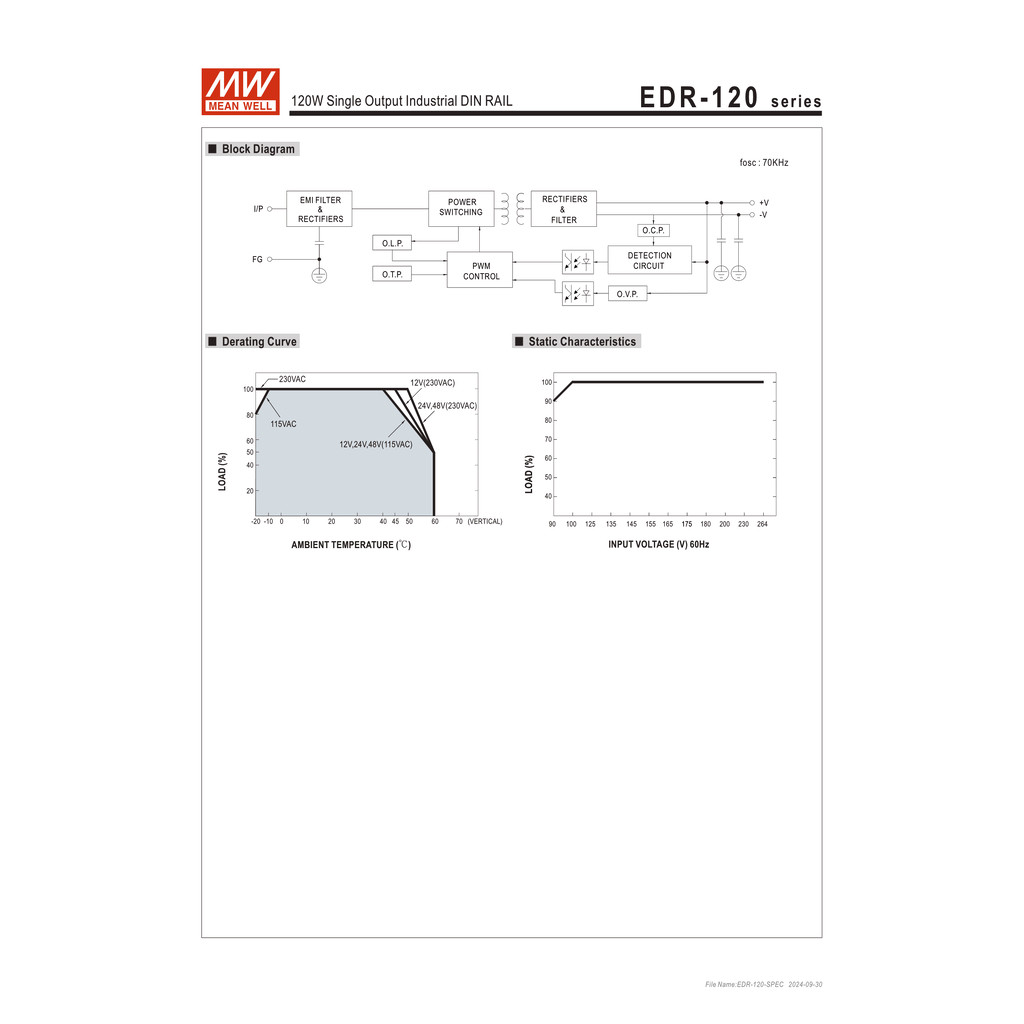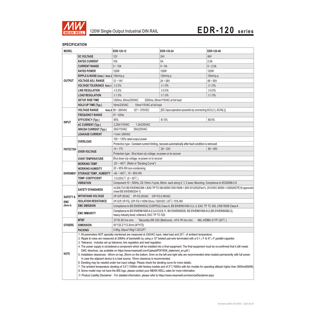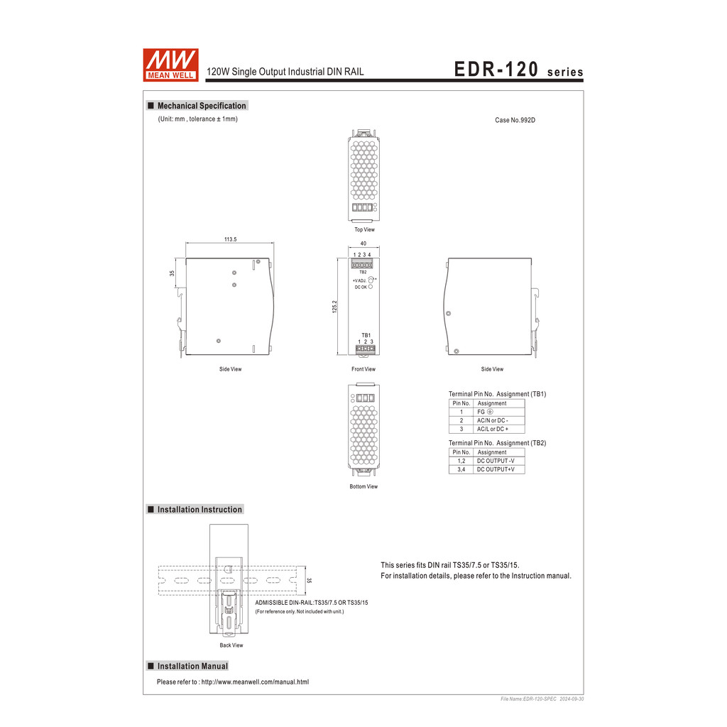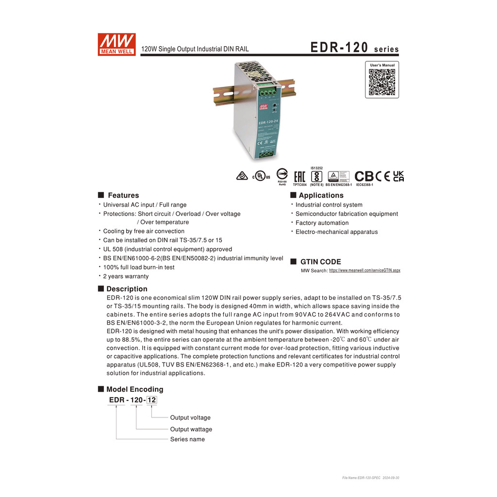 EDR-120-24 | MEAN WELL DIN Rail Switching Power Supply 24V 5A 120W รับประกัน 2 ปี ออกใบกำกับภาษีได้