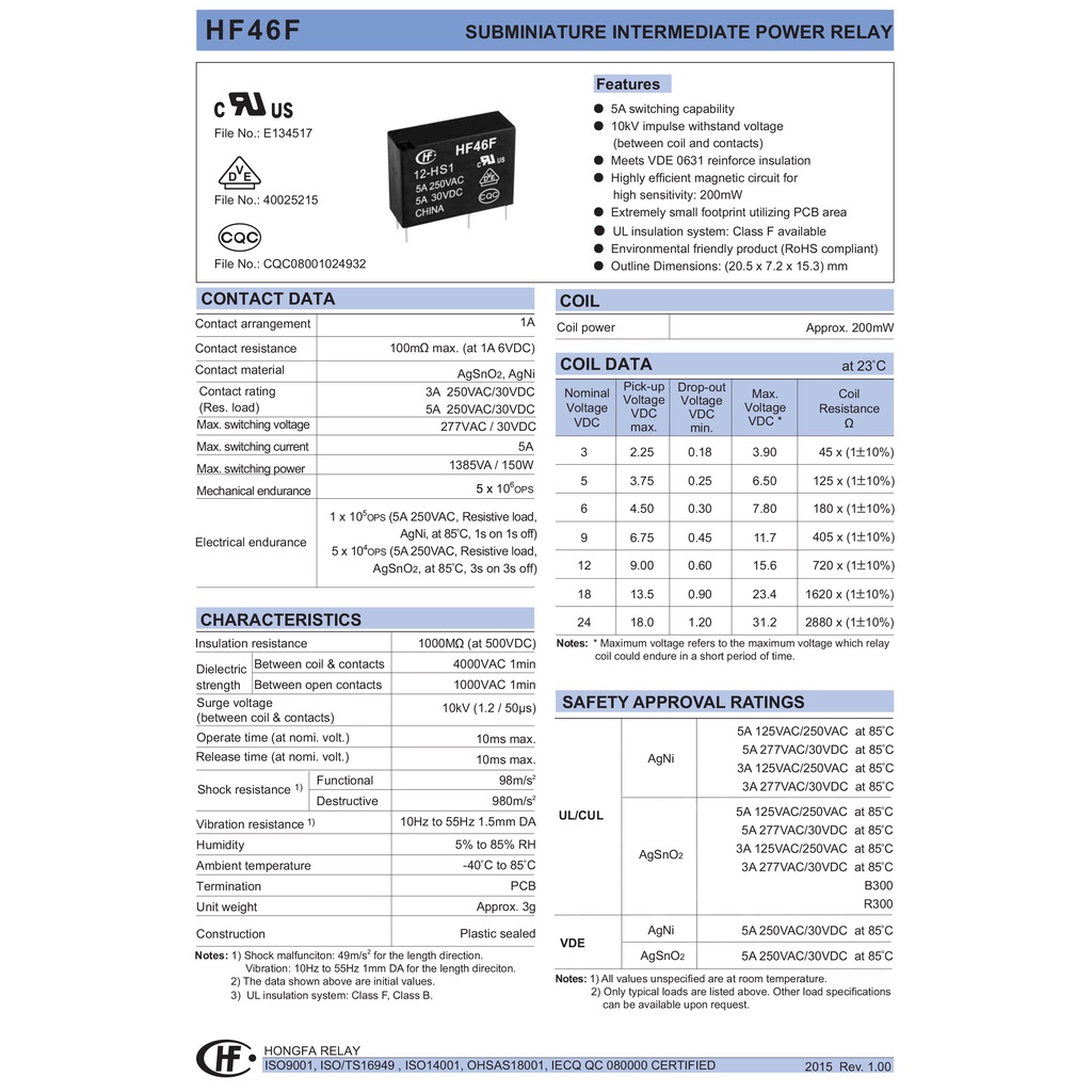 Relay HF46F 12-HS1 รีเลย์ 5V 12V 24V 5A 4ขา