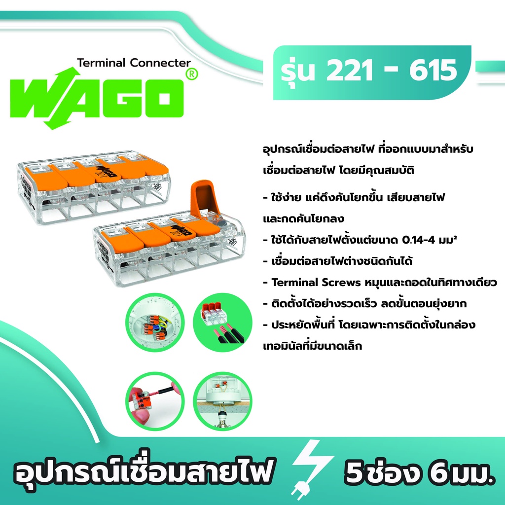 Wago อุปกรณ์เชื่อมสายไฟ Terminal Connecter 5ช่อง 6มม. [221-615 / 1 ชิ้น] ของแท้ 100%