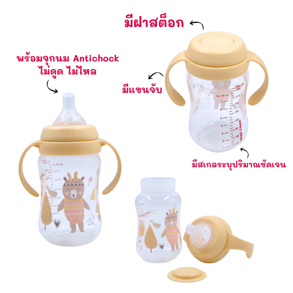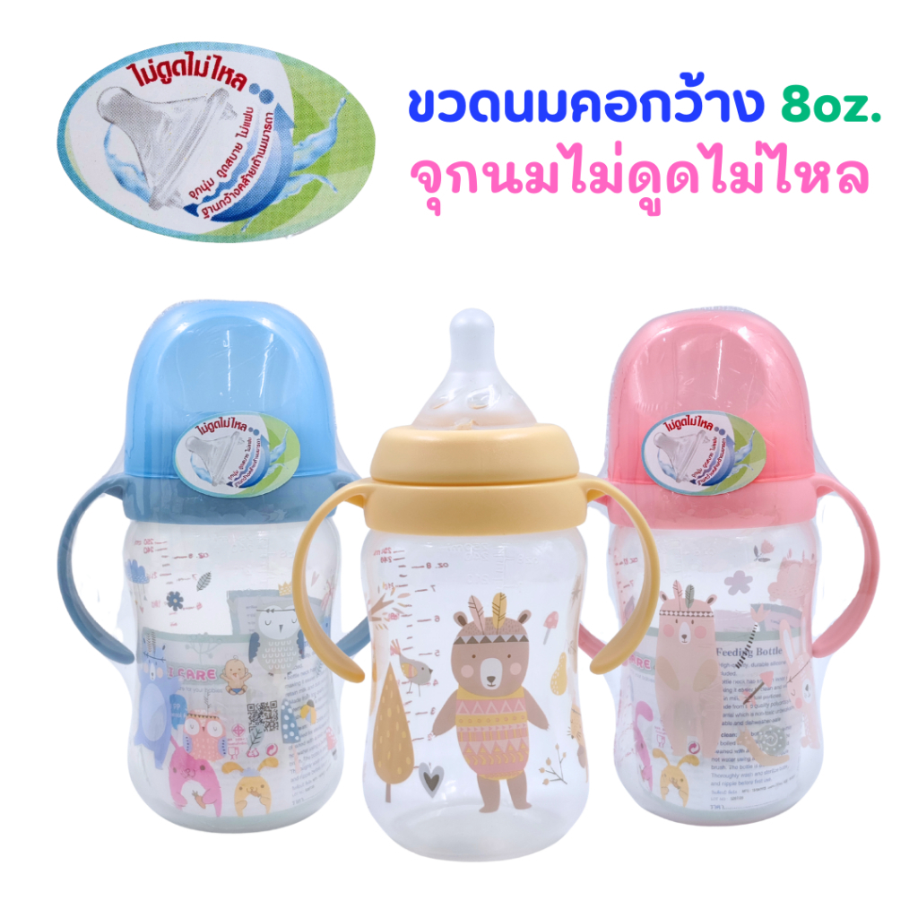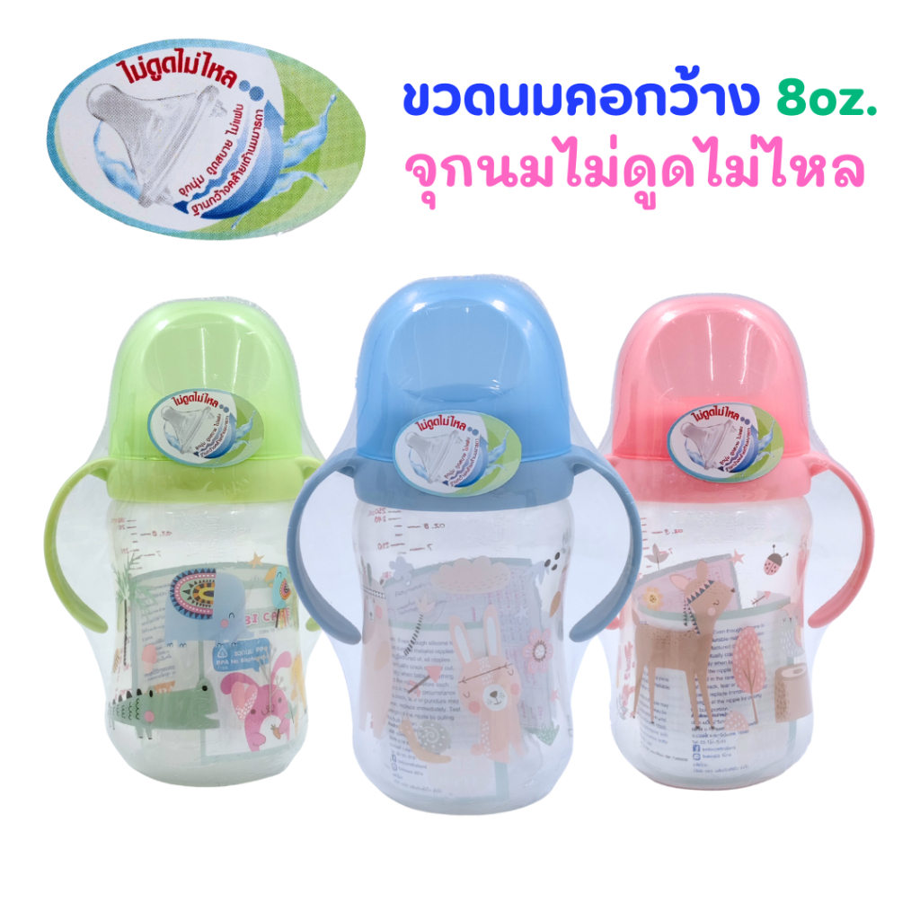 (Set3ขวด)Babi Care ขวดนมเบบี้แคร์ ขวดนมคอกว้าง 8oz.จัมโบ้ แขนจับ (จุกนมไม่ดูดไม่ไหล) จุกนมไซส์ M