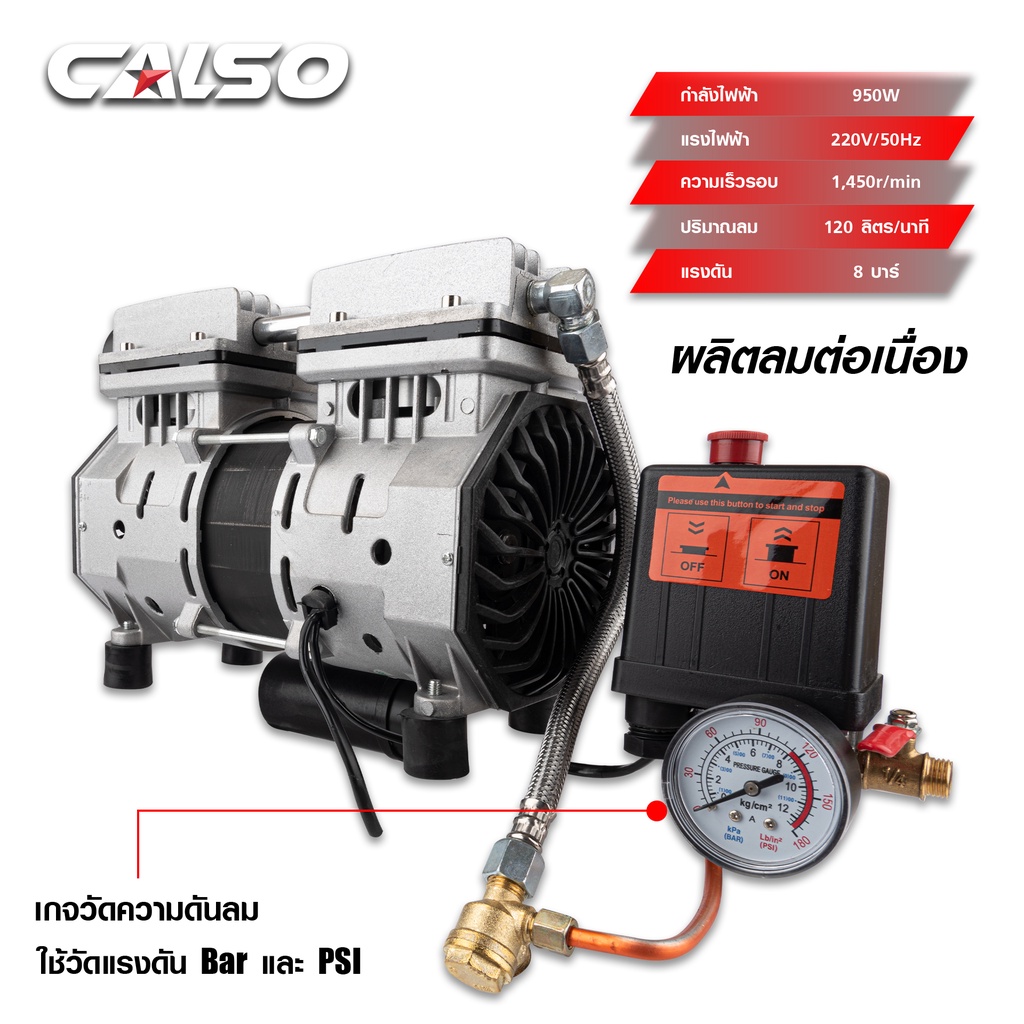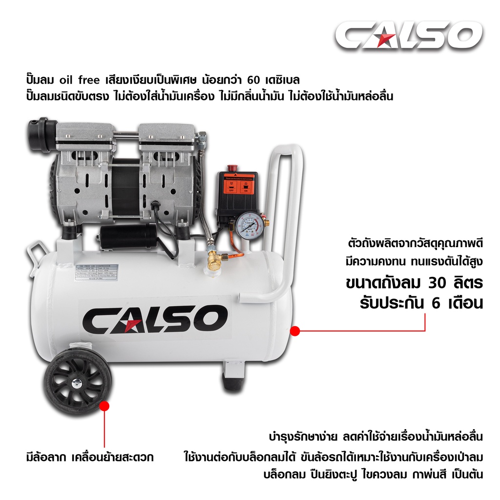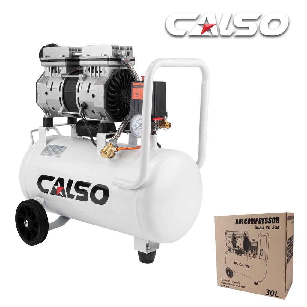 CALSO Air pump ปัมลมพร้อมอุปกรณ์ ปั๊มลมไม่ใช้น้ำมัน เสียงเงียบ รุ่น Oil Free ขนาด 30 ลิตรชนิดขับตรงบำรุงรักษาง่าย เยี่ยม