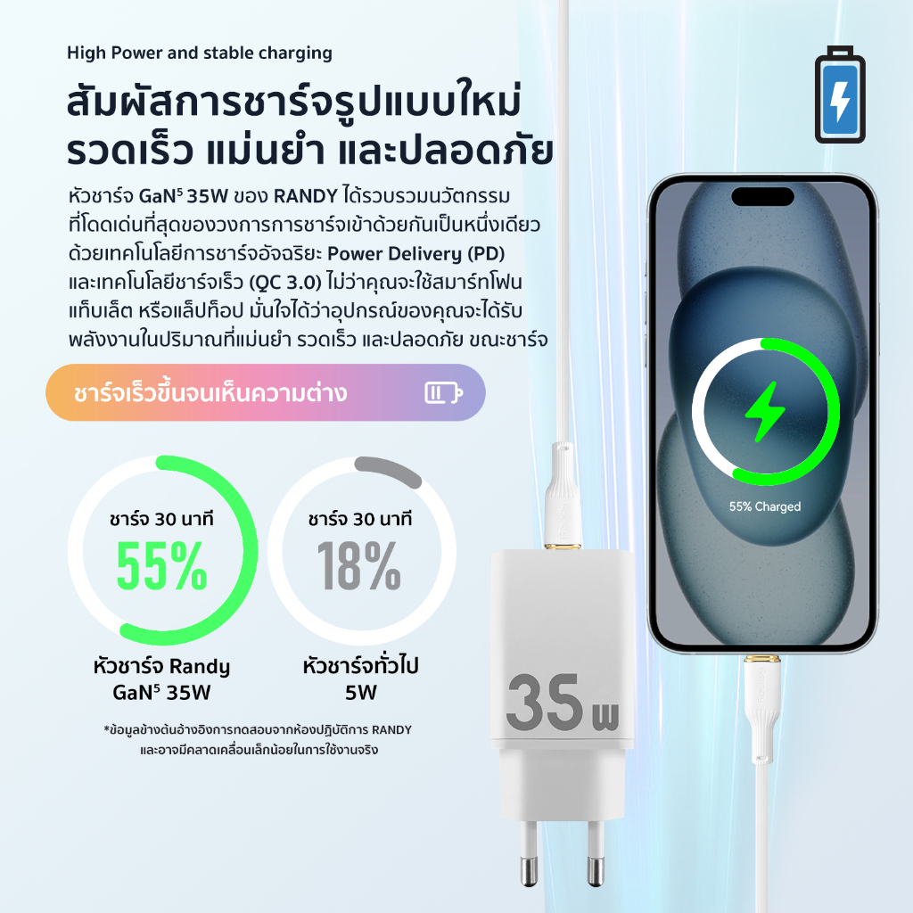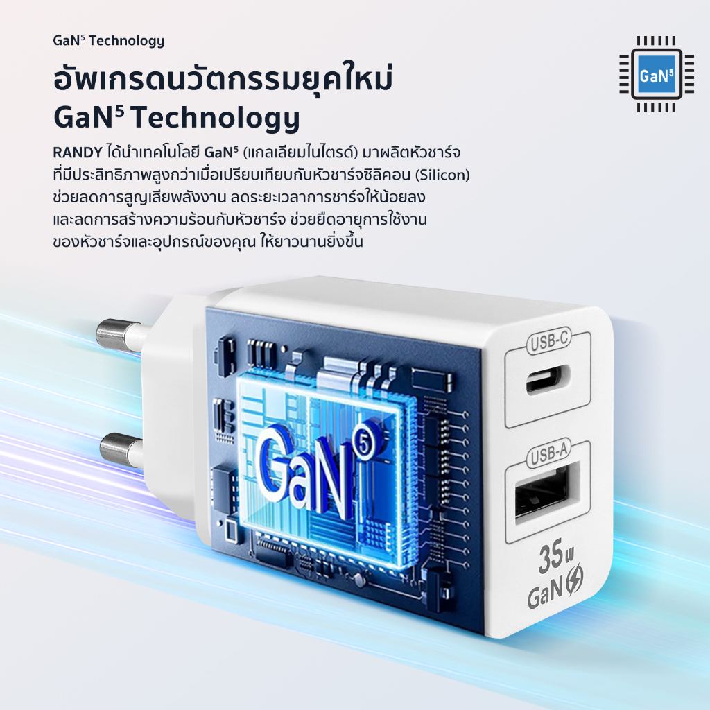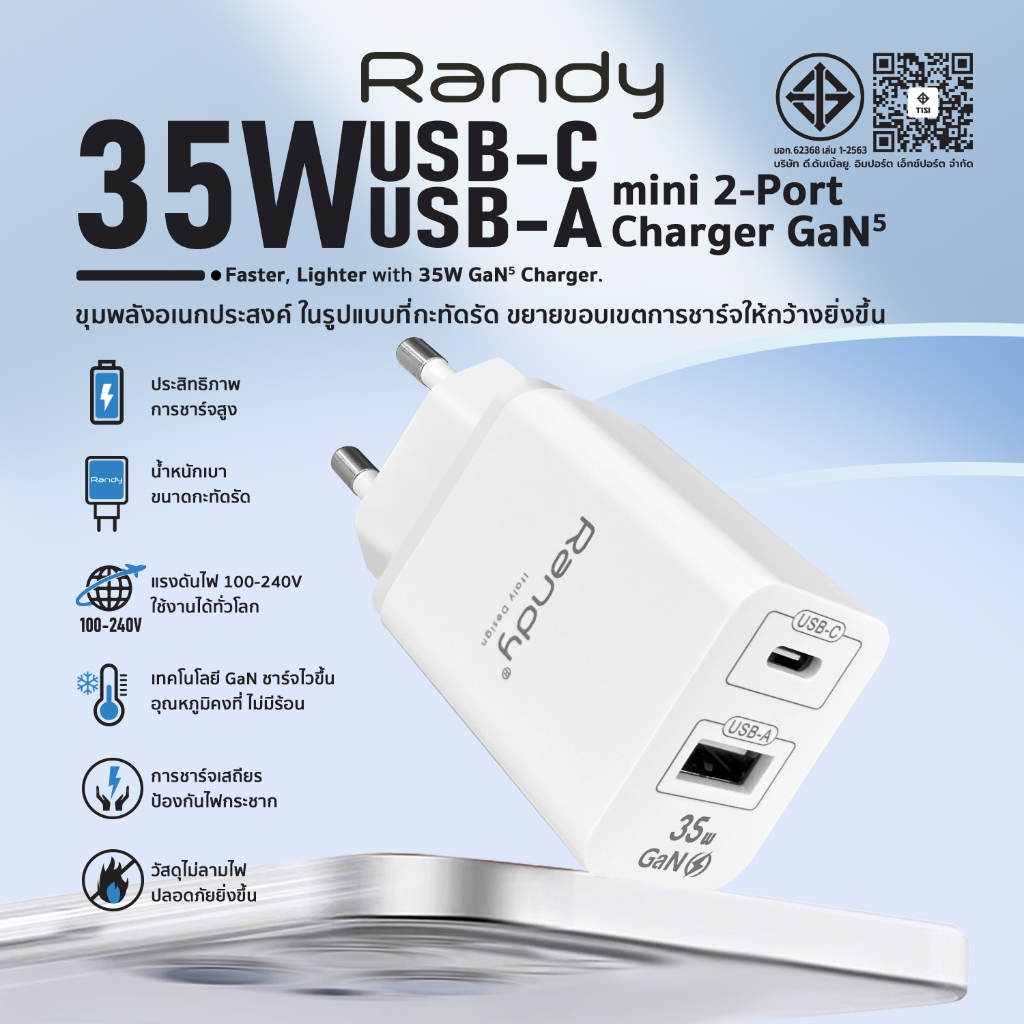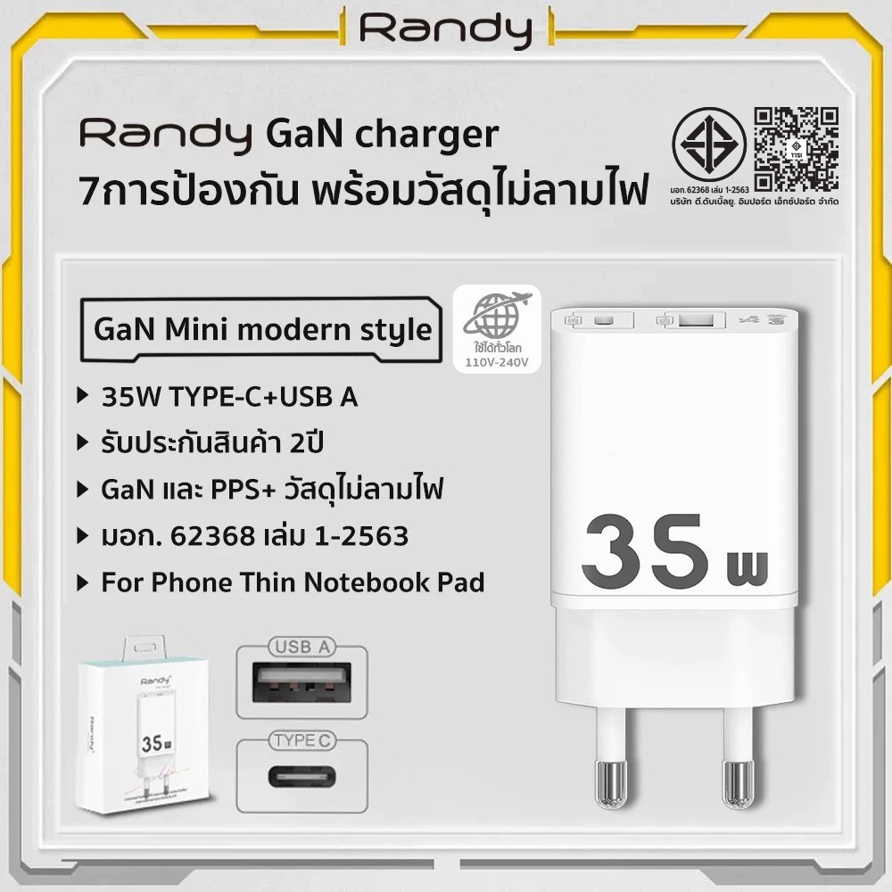 Randyหัวชาร์จ GaN35W FastChargerAdater เหมาะสำหรับชาร์จ แท็บเล็ต เกมคอนโซล powerbank มือถือ หูฟังไร้สายและนาฬิกาอัจฉริยะ