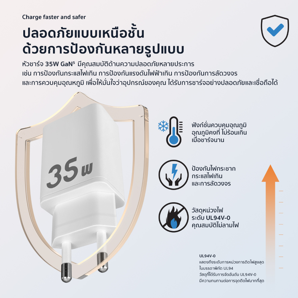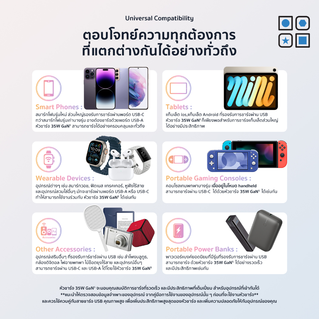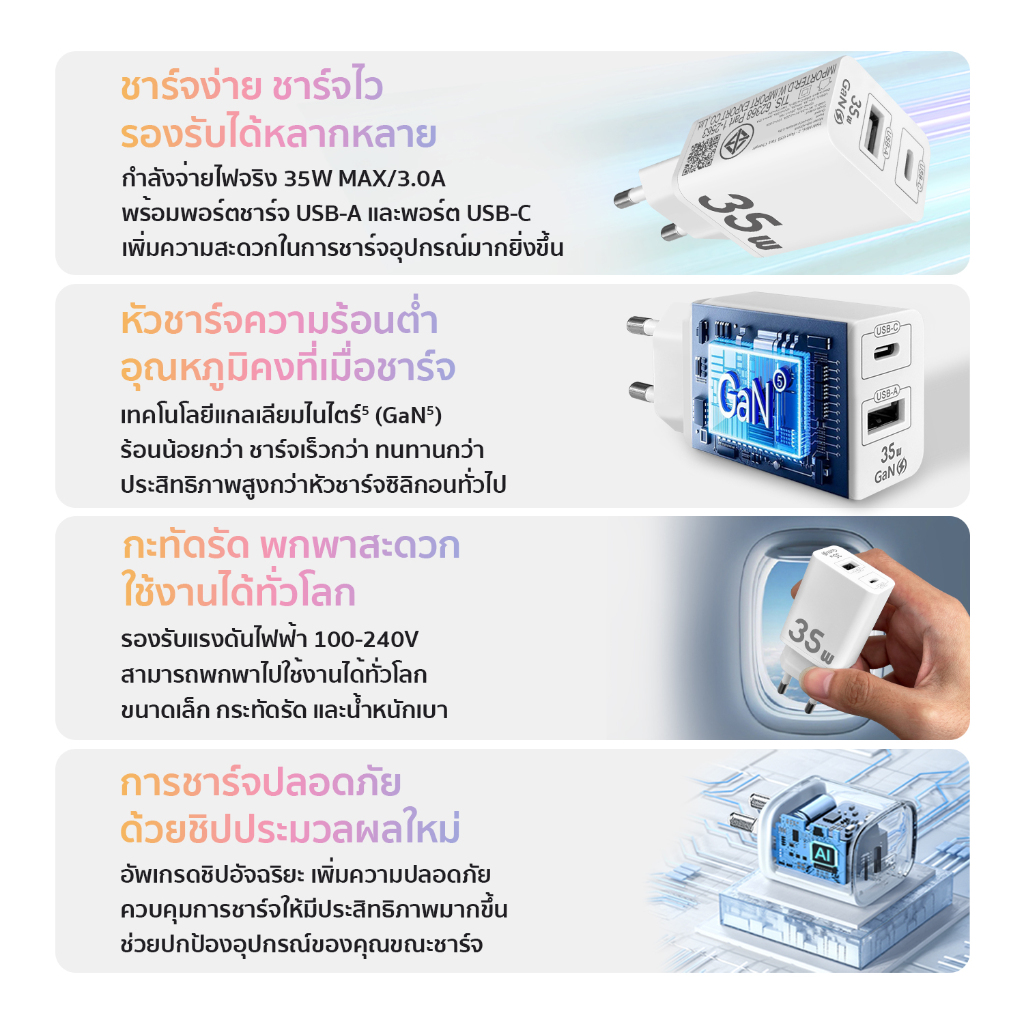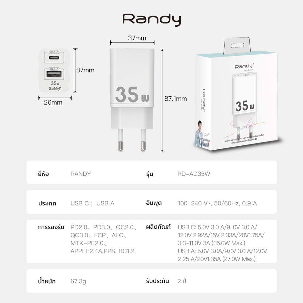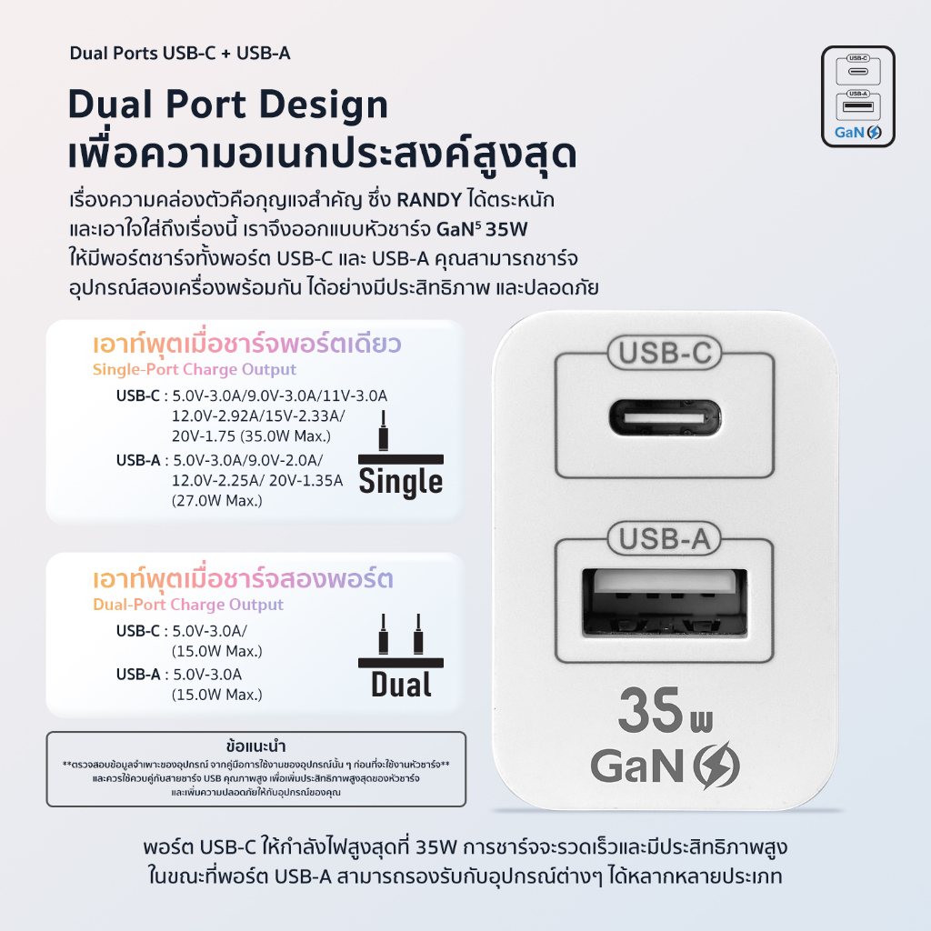 Randyหัวชาร์จ GaN35W FastChargerAdater เหมาะสำหรับชาร์จ แท็บเล็ต เกมคอนโซล powerbank มือถือ หูฟังไร้สายและนาฬิกาอัจฉริยะ