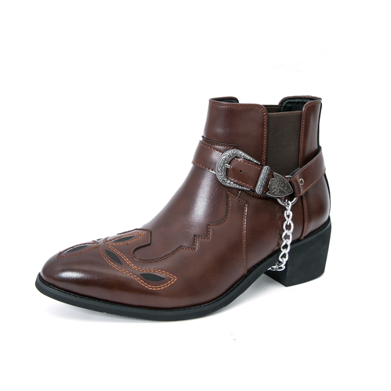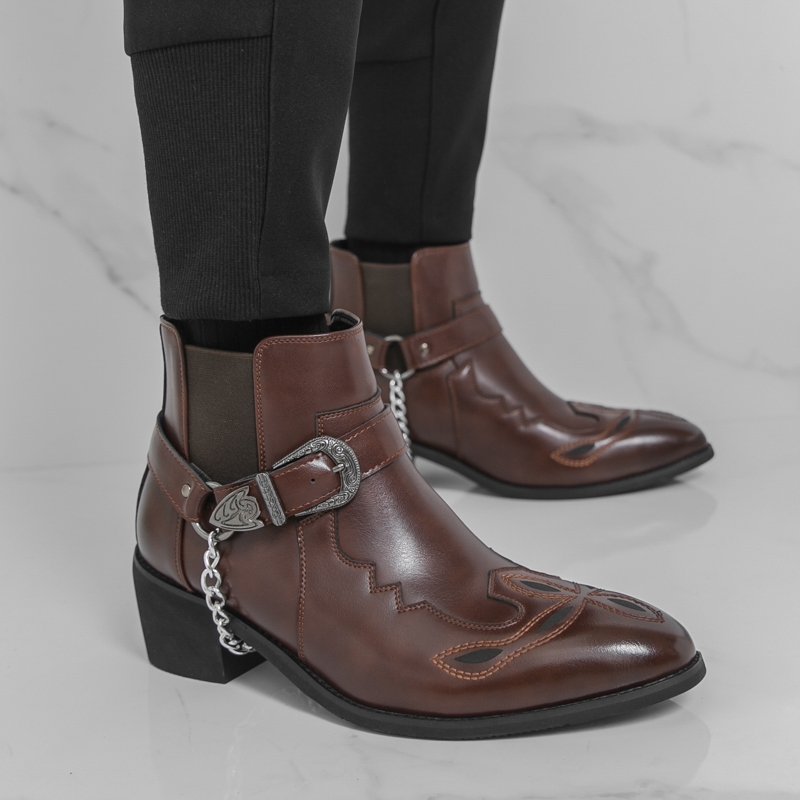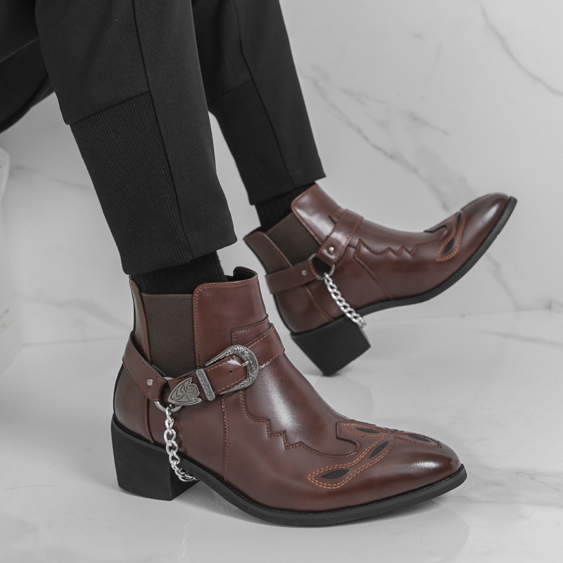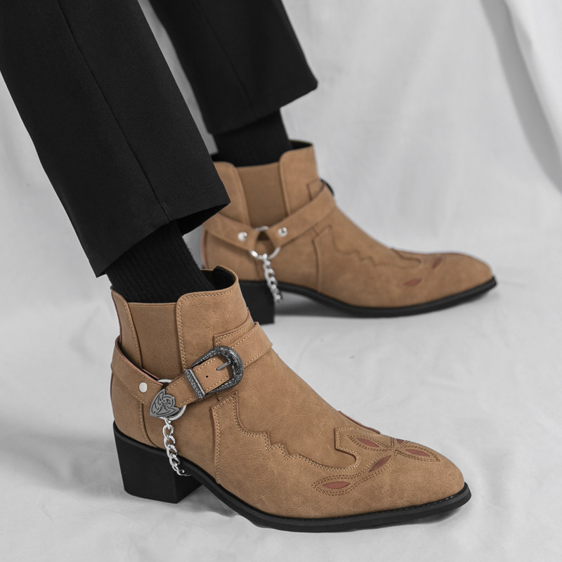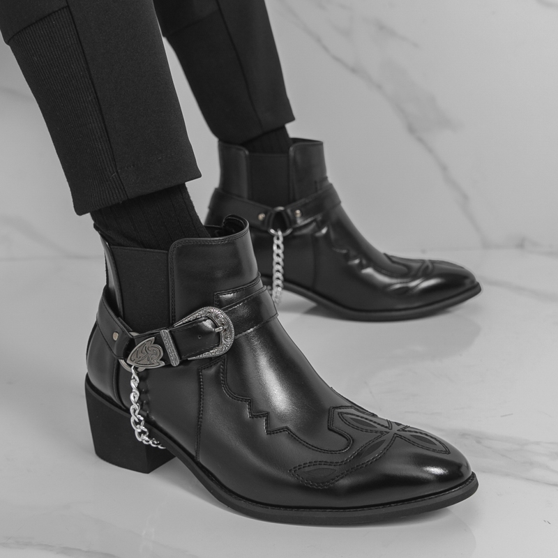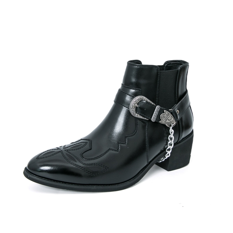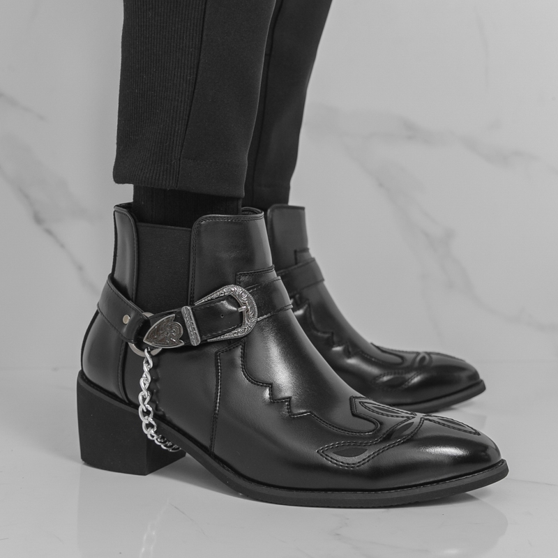 ผู้ชายสีดําคาวบอยรองเท้าย้อนยุคคลาสสิกธุรกิจรองเท้าหนังข้อเท้าส้นรองเท้า