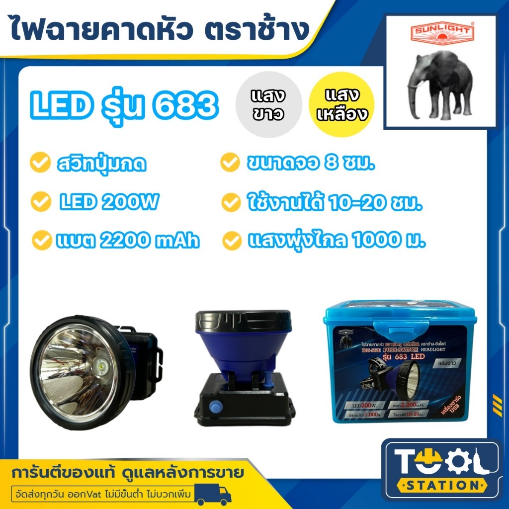 ไฟฉายคาดหัวตราช้าง หัวไฟตราช้าง หน้าไฟตราช้าง รุ่น 683 สวิทซ์ปุ่มกด แสงขาว และ แสงเหลือง
