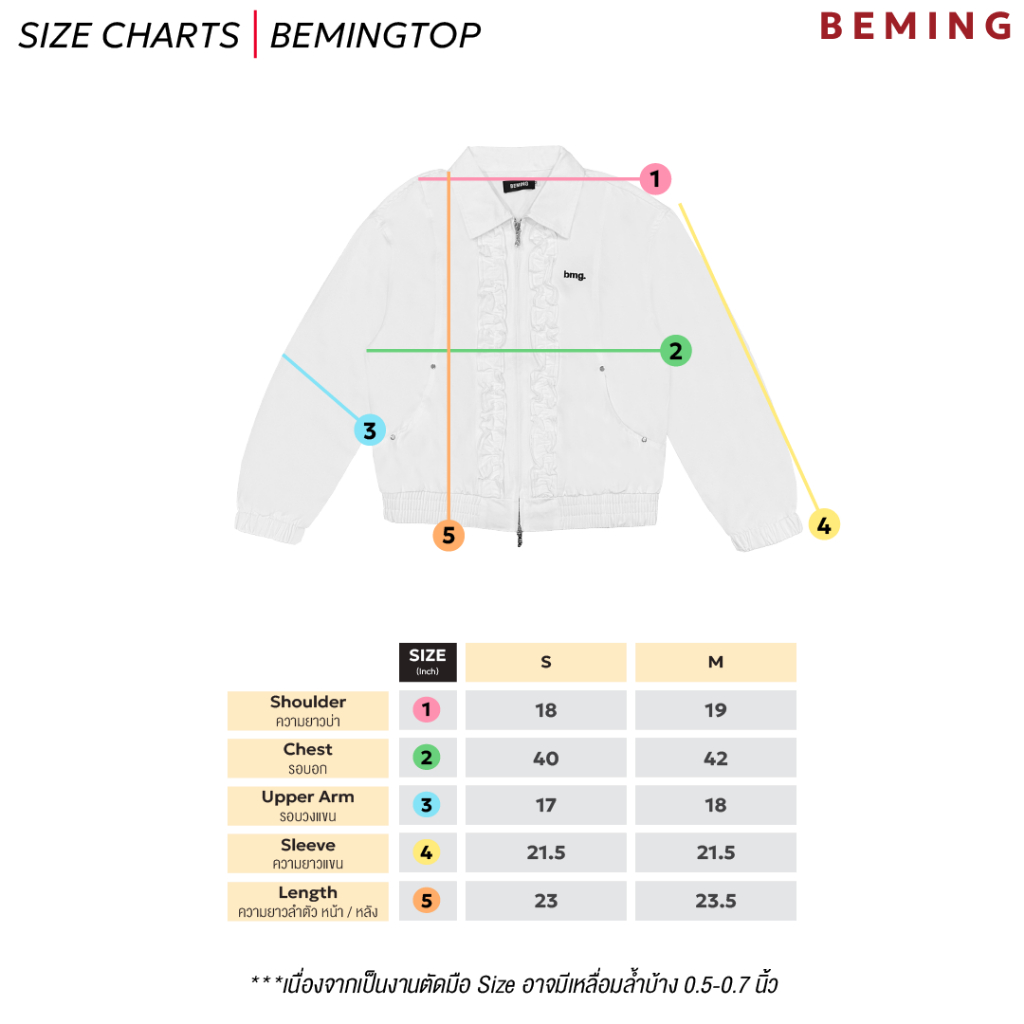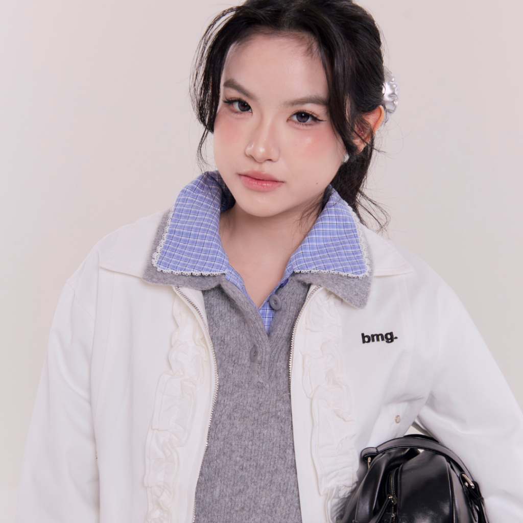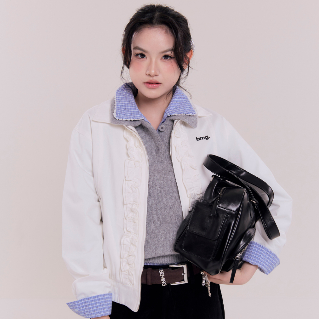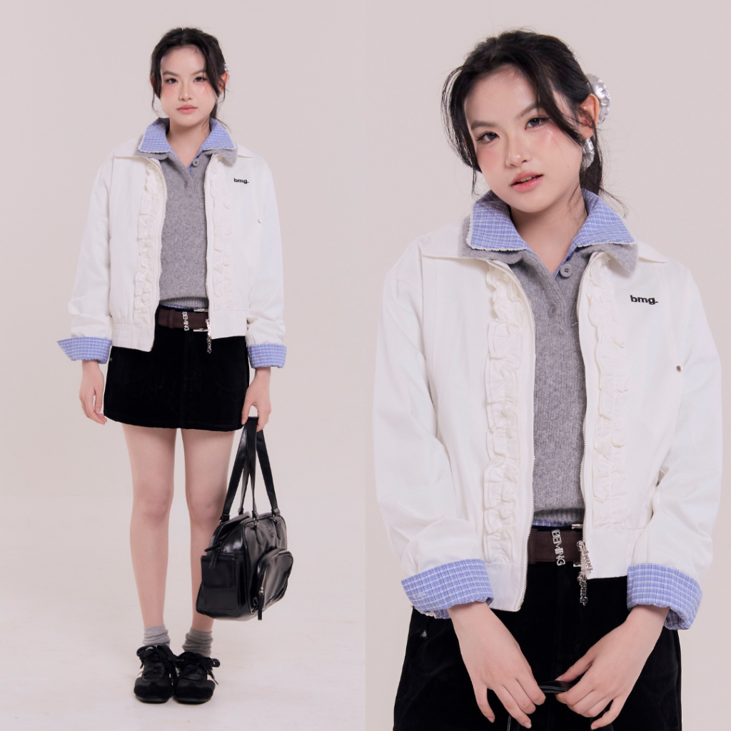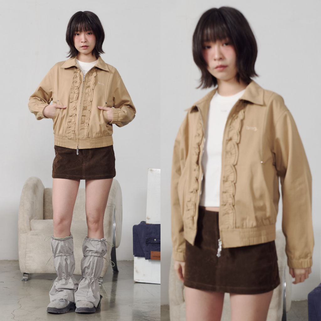 Bemingtop1079(S-M)-BMG Ruffle Zip Bomber - แจ็กเก็ตทรงบอมเบอร์ ดีเทลระบาย (Ruffle) ด้านหน้าและดีเทลซิปที่เป็น BEMING
