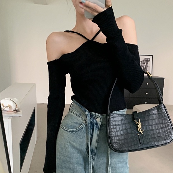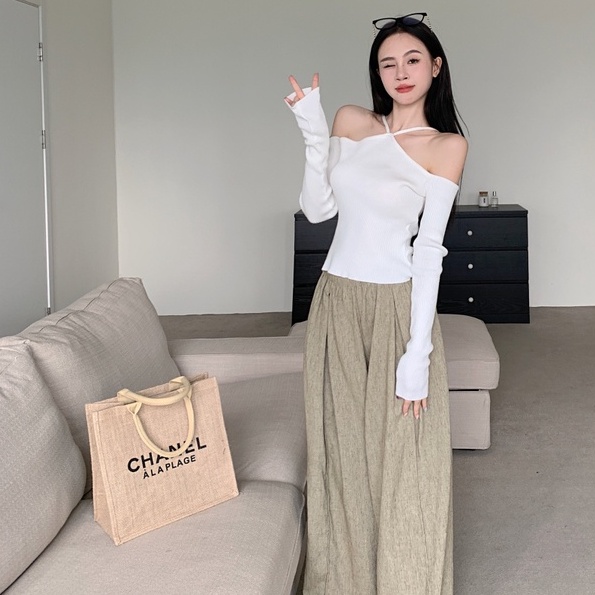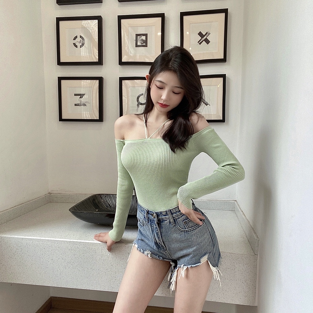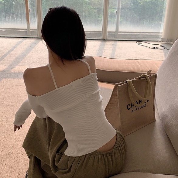 anna 11201-1🌹เสื้อไหมพรมแขนยาวปาดไหล่สายคล้อง เนื้อผ้าดียืดได้เยอะ ใส่แมทช์ได้หลายลุค เสื้อยืดแขนยาวไหมพรมปาดไหล่เซ็กซี่
