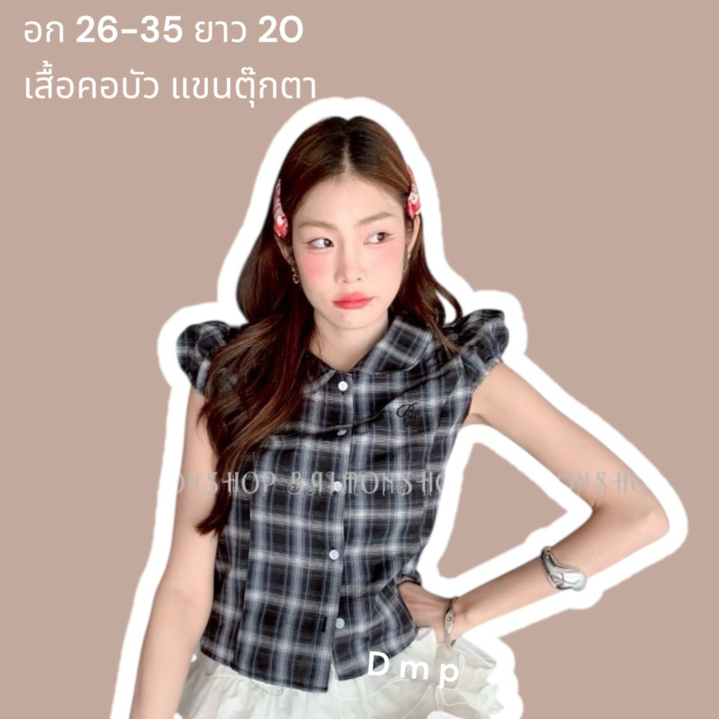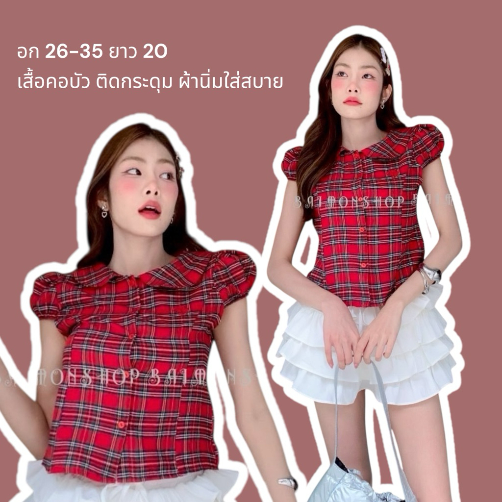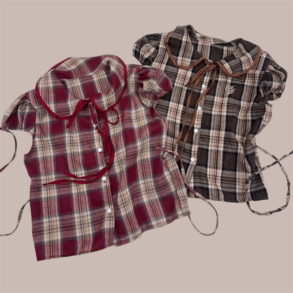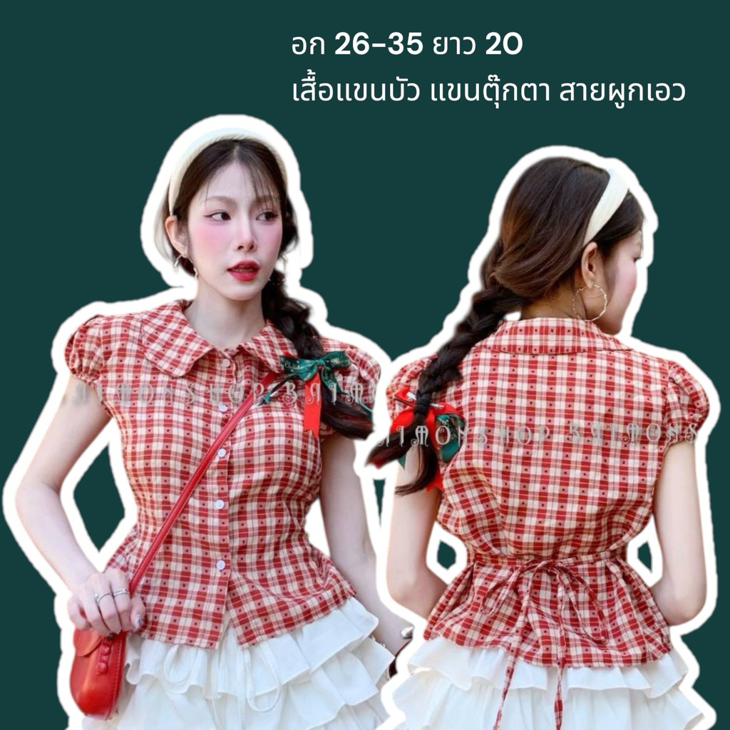 ambellaพร้อมส่ง เสื้อคอบัวลายสก็อตสายแต่งผูกอกงานน่ารักมากทรงเข้ารูปใส่แล้วสวย