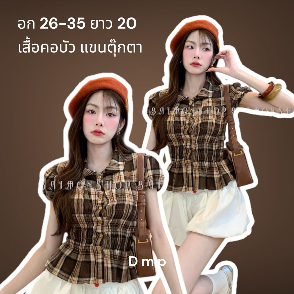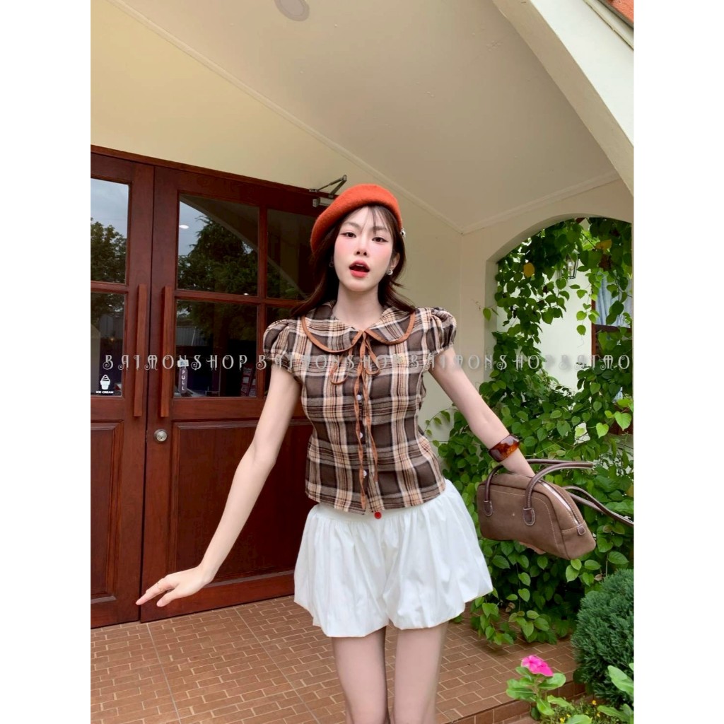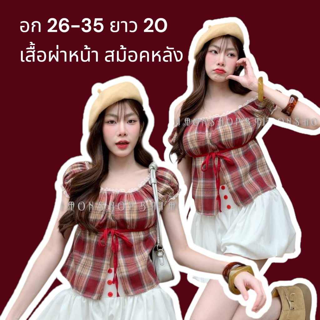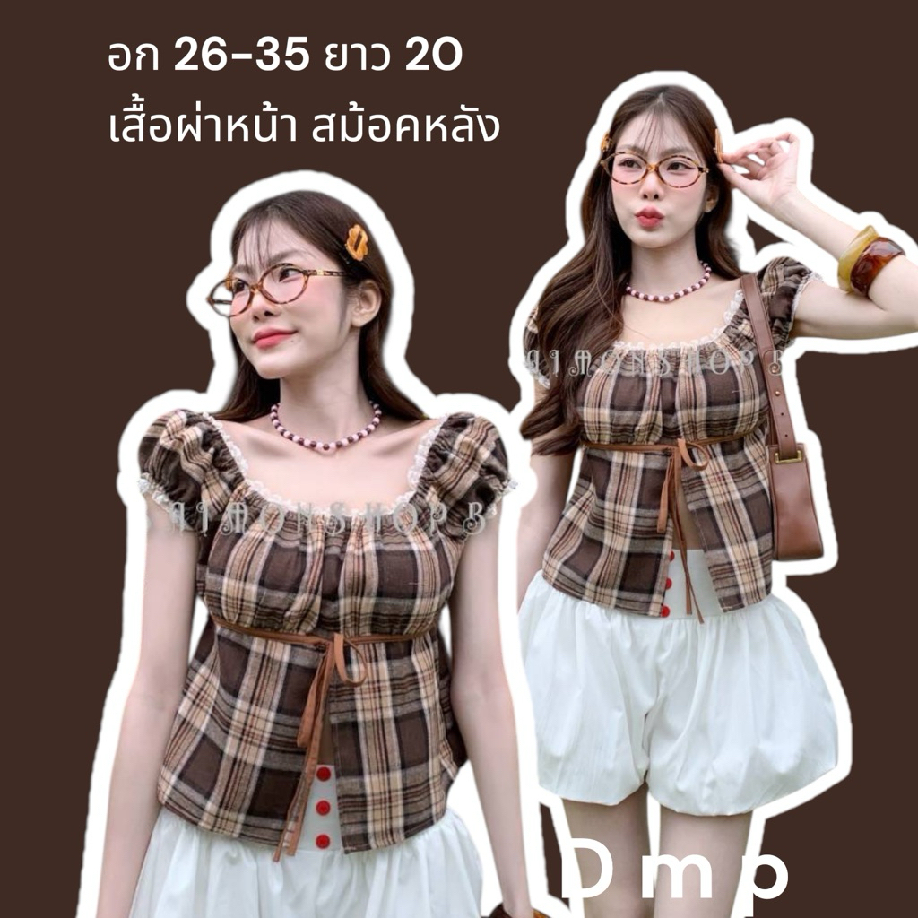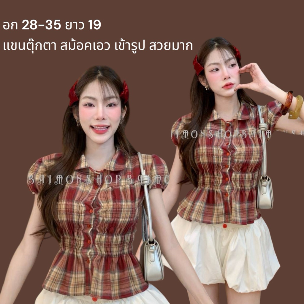 ambellaพร้อมส่ง เสื้อคอบัวลายสก็อตสายแต่งผูกอกงานน่ารักมากทรงเข้ารูปใส่แล้วสวย