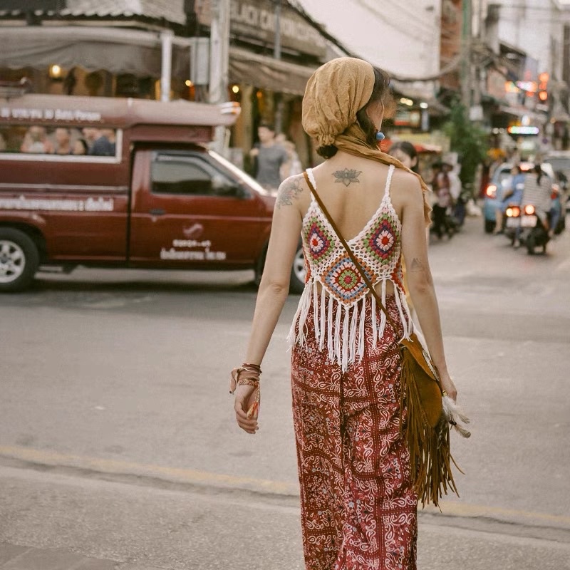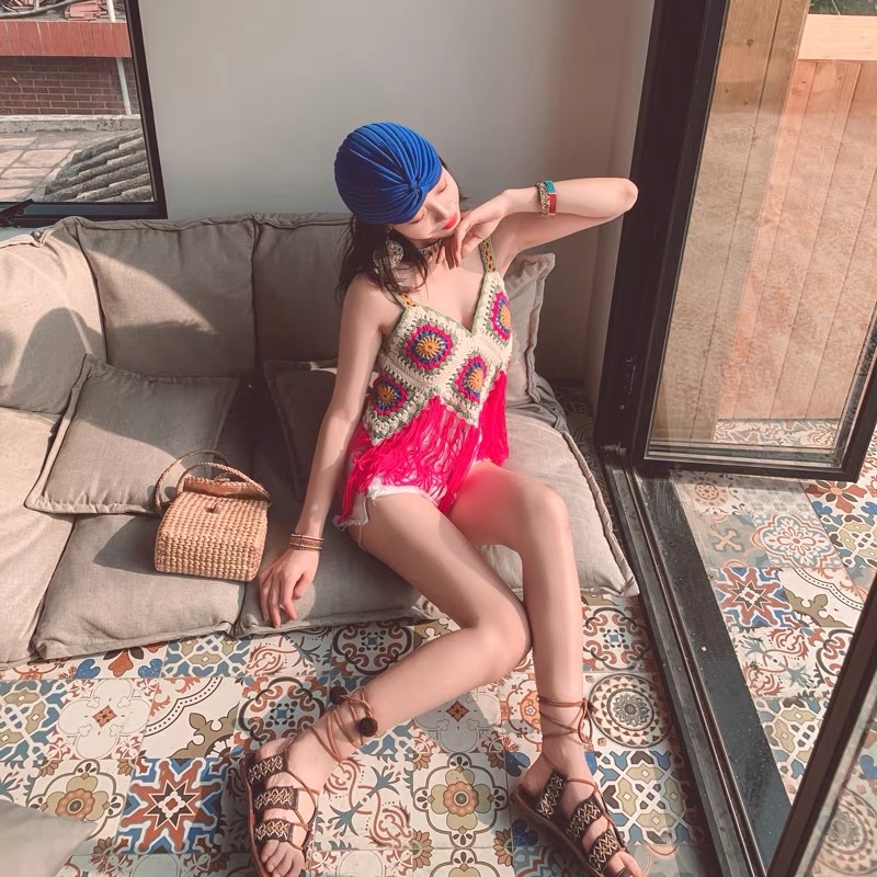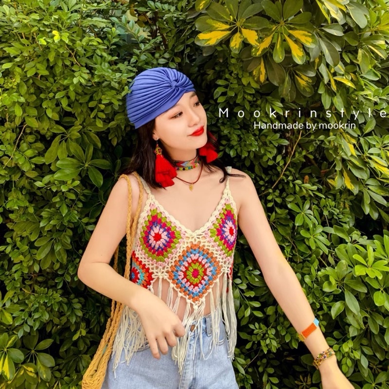🍑mookrinstyle🍑เสื้อสายเดี่ยวถักชายกรุย งานสวยสีสดใส ใส่ไปทะเลชิวๆ