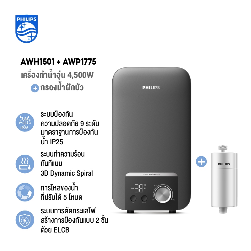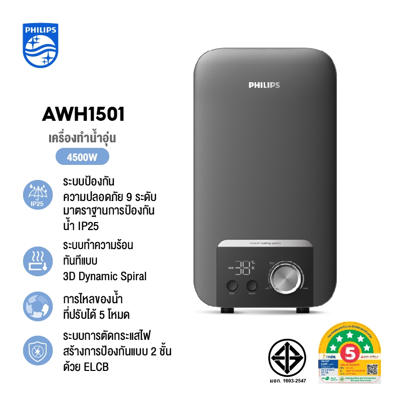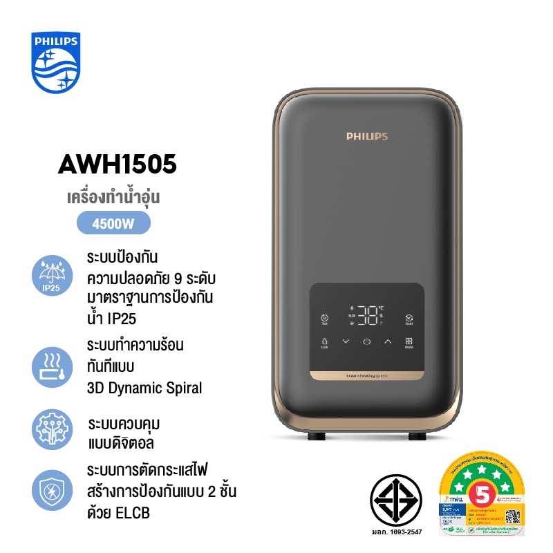 Philipswater เครื่องท ำน้ำอุ่น 4500 วัตต์ รุ่น AWH1501 / AWH1504 / AWH1505 ประหยัดไฟ สีเทา