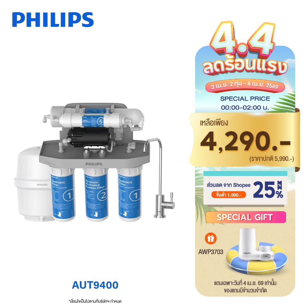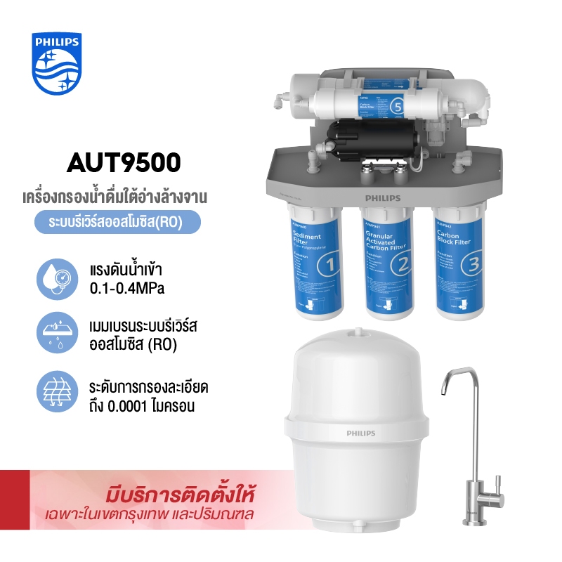 Philipswater AUT9400 เครื่องกรองน้ำดื่มใต้อ่างล้างจาน เครื่องกรองน้ำ กรอง 5 ขั้นตอน ระบบการกรอง RO