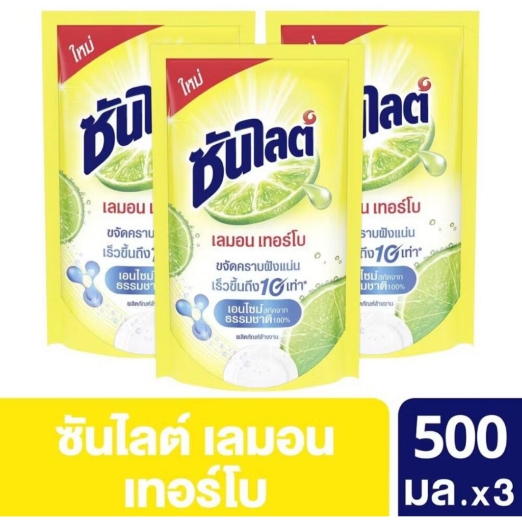 [แพค3ถุง]Sunlight น้ำยาล้างจานซันไลต์ เลมอน เทอร์โบ ขนาด 500มล.x 3ถุง