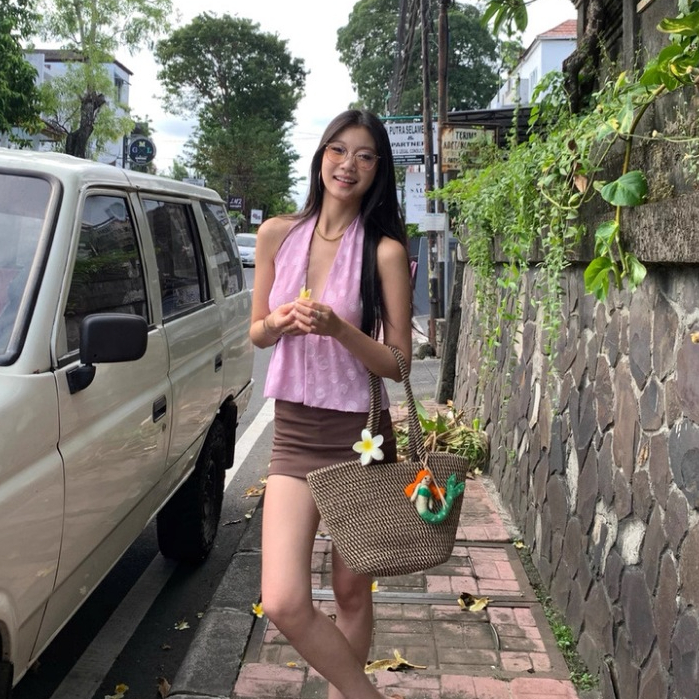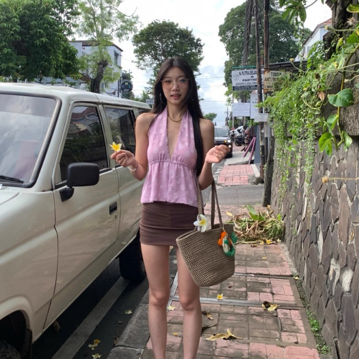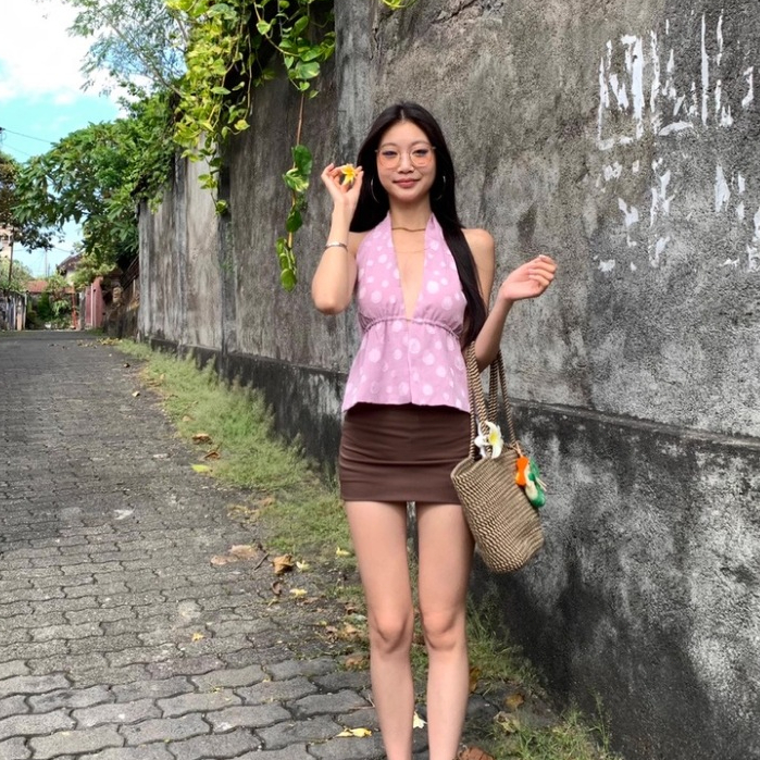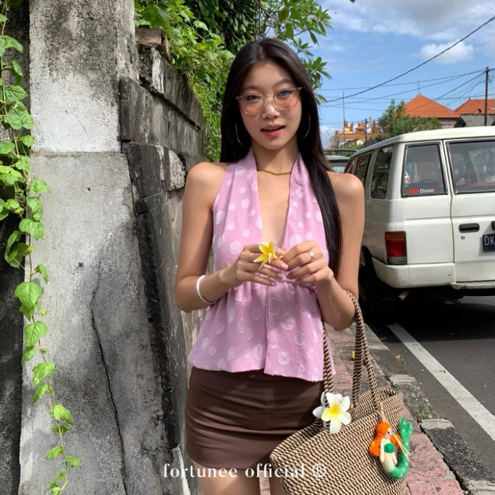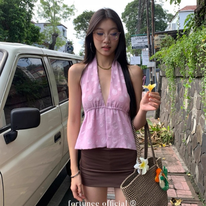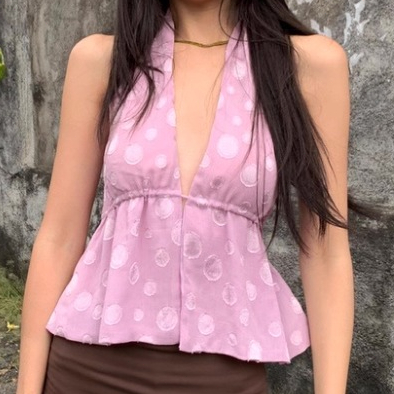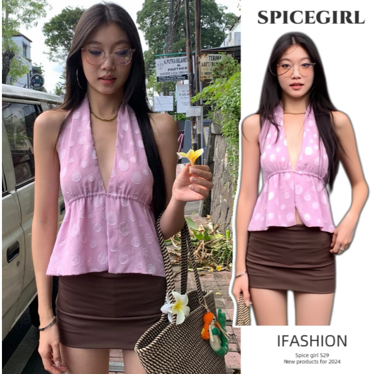 🍓Spice girl🍓ชุดสองชิ้น เสื้อสายเดี่ยวคอวี+กระโปรงเอ ลายจุดสีชมพู เปิดหลัง มีความยืดหยุ่นสูงใส่สบาย สไตล์ฝรั่งเศส