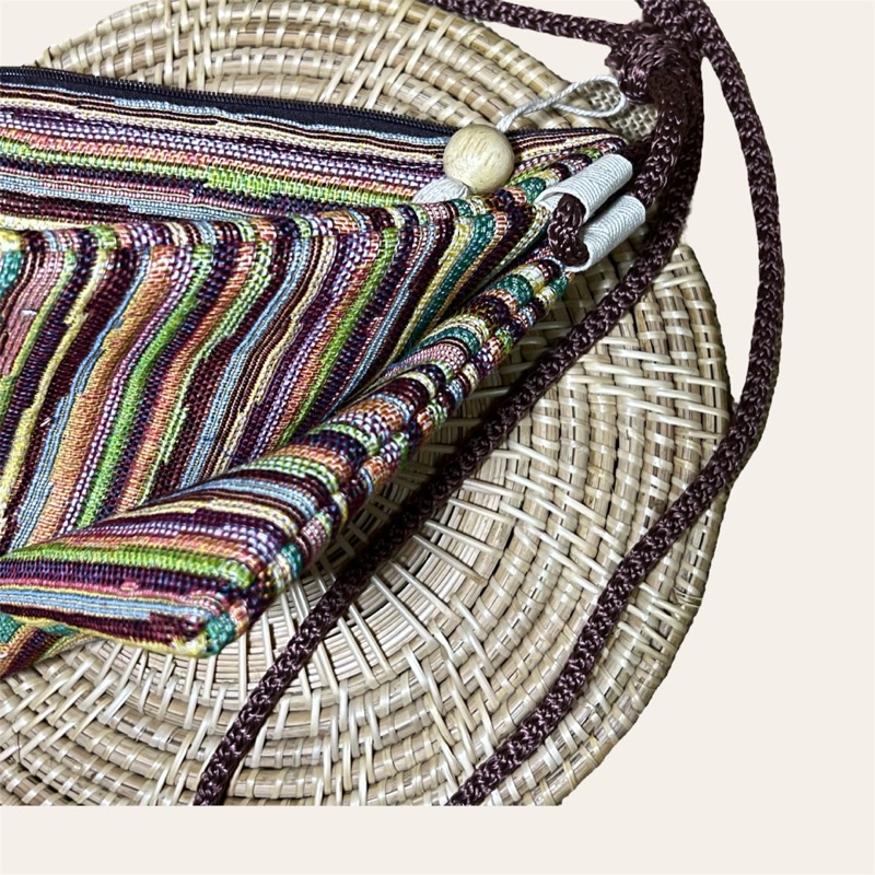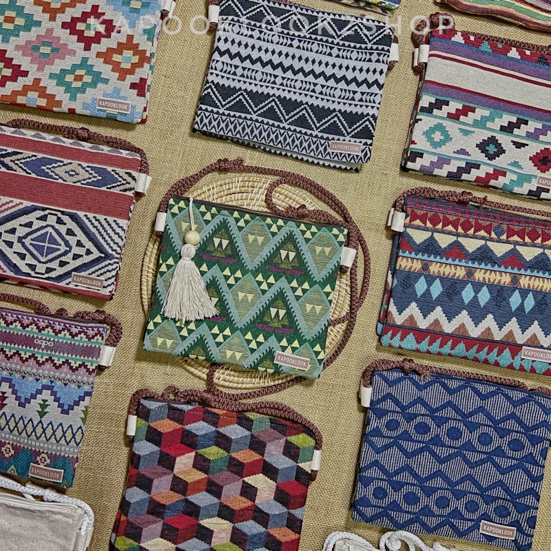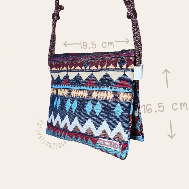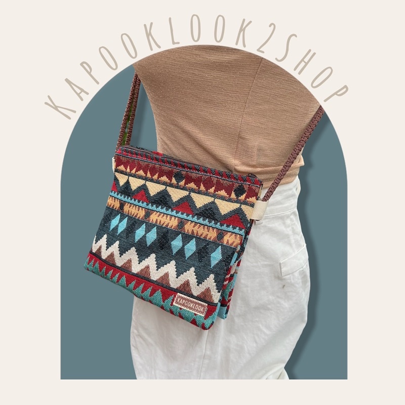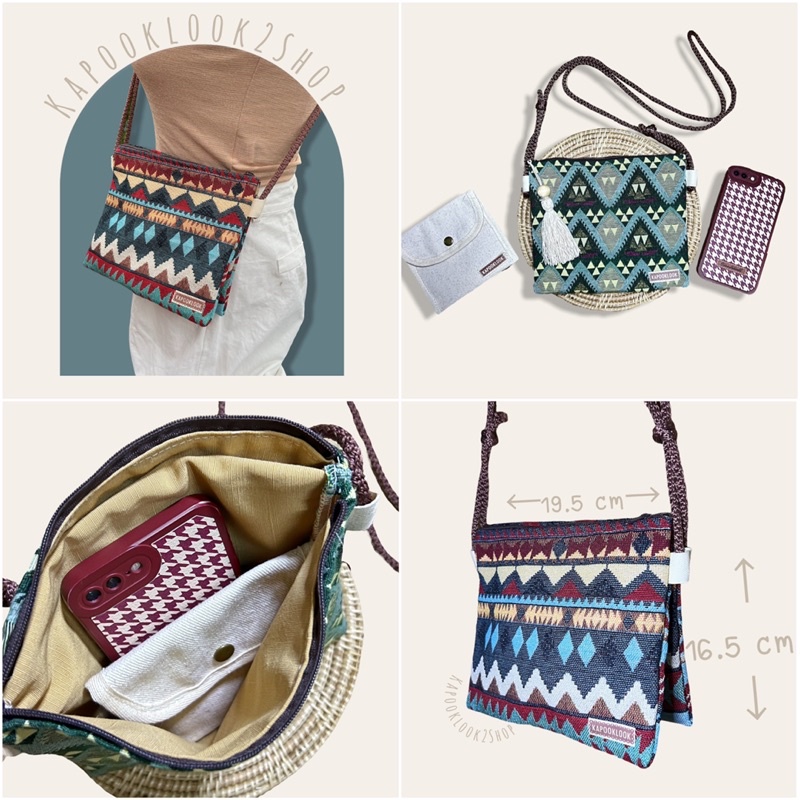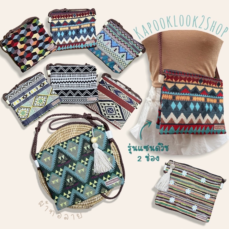 กระเป๋าสะพายข้าง รุ่นแซนด์วิช 2 ช่องประกบผ้าทอลาย กระเป๋าสะพายข้างใบกลาง กระเป๋าผ้า แต่งพู่สไตล์โบฮีเมียน เลือกลาย🌿