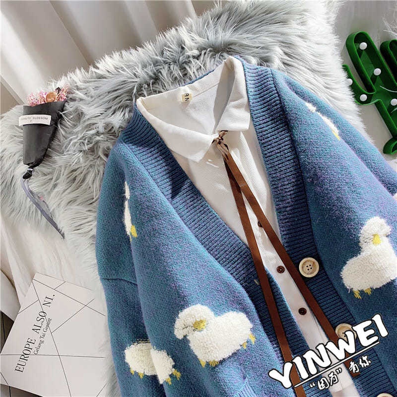 🥰คาร์ดิแกนผู้หญิงสไตล์เกาหลี คอวี แขนยาว ลายแกะน้อย ไซส์ S-3XL สไตล์น่ารัก
