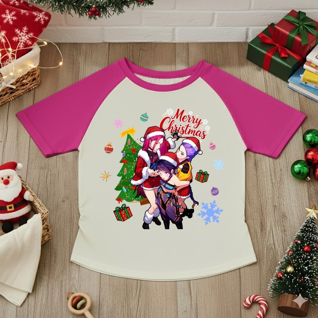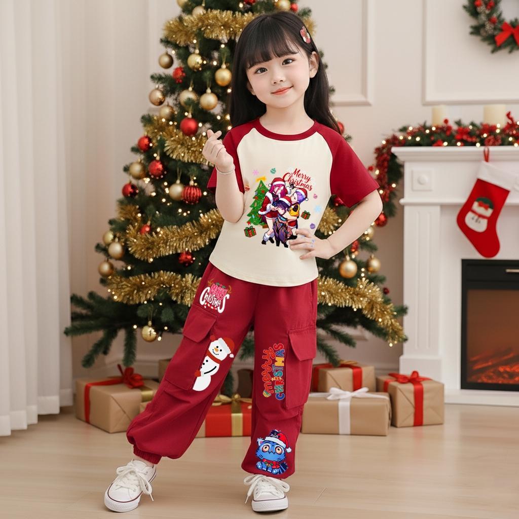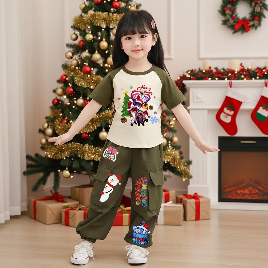 ชุดเซ็ทเด็ก2ชิ้นคริสต์มาสลายkpop demon hunter เสื้อยืดลายการ์ตูน+กางเกงคาร์โก้ สไตล์เกาหลี 9471