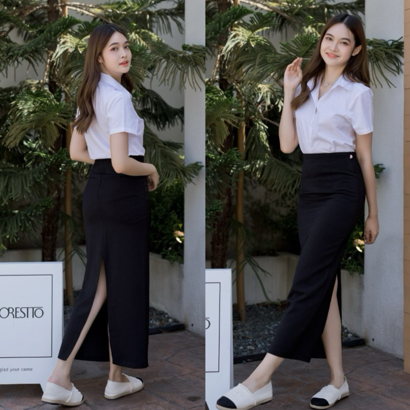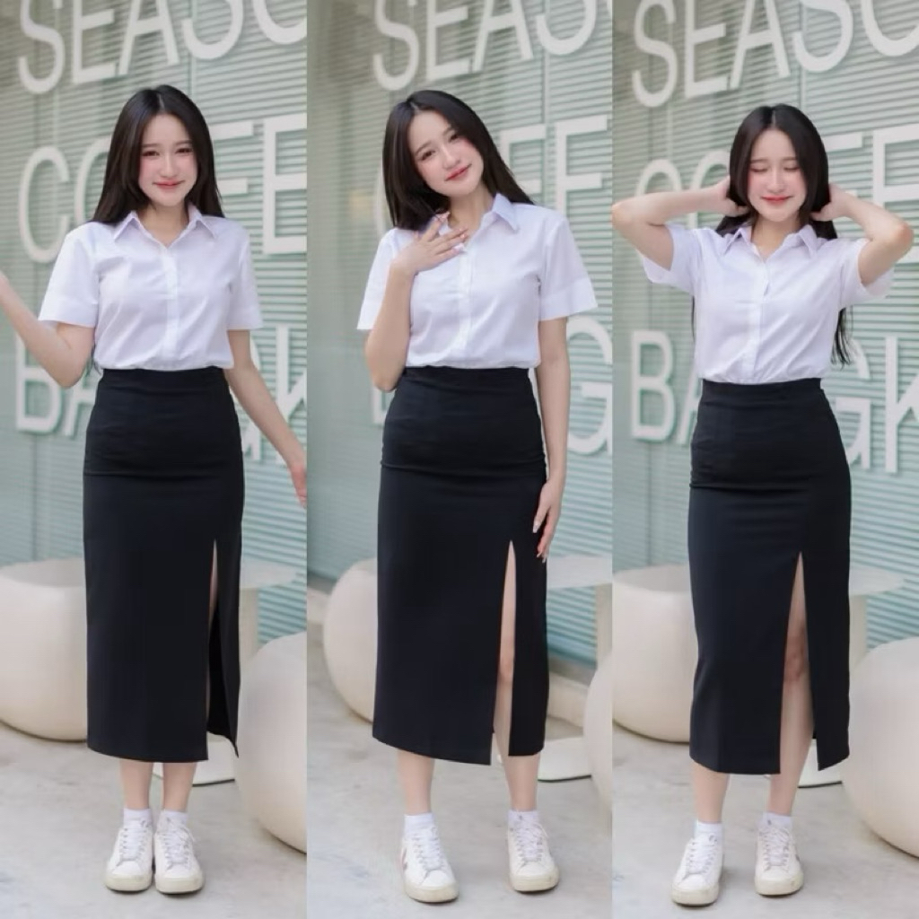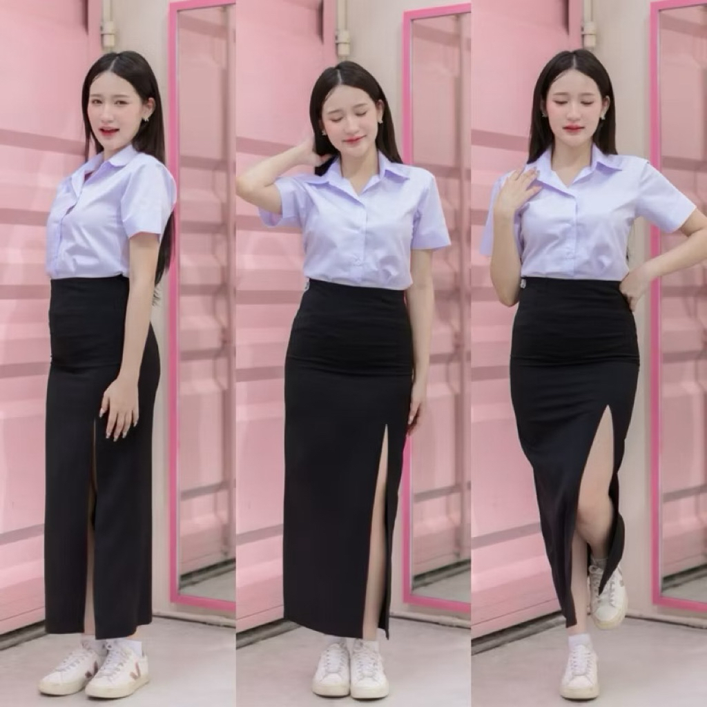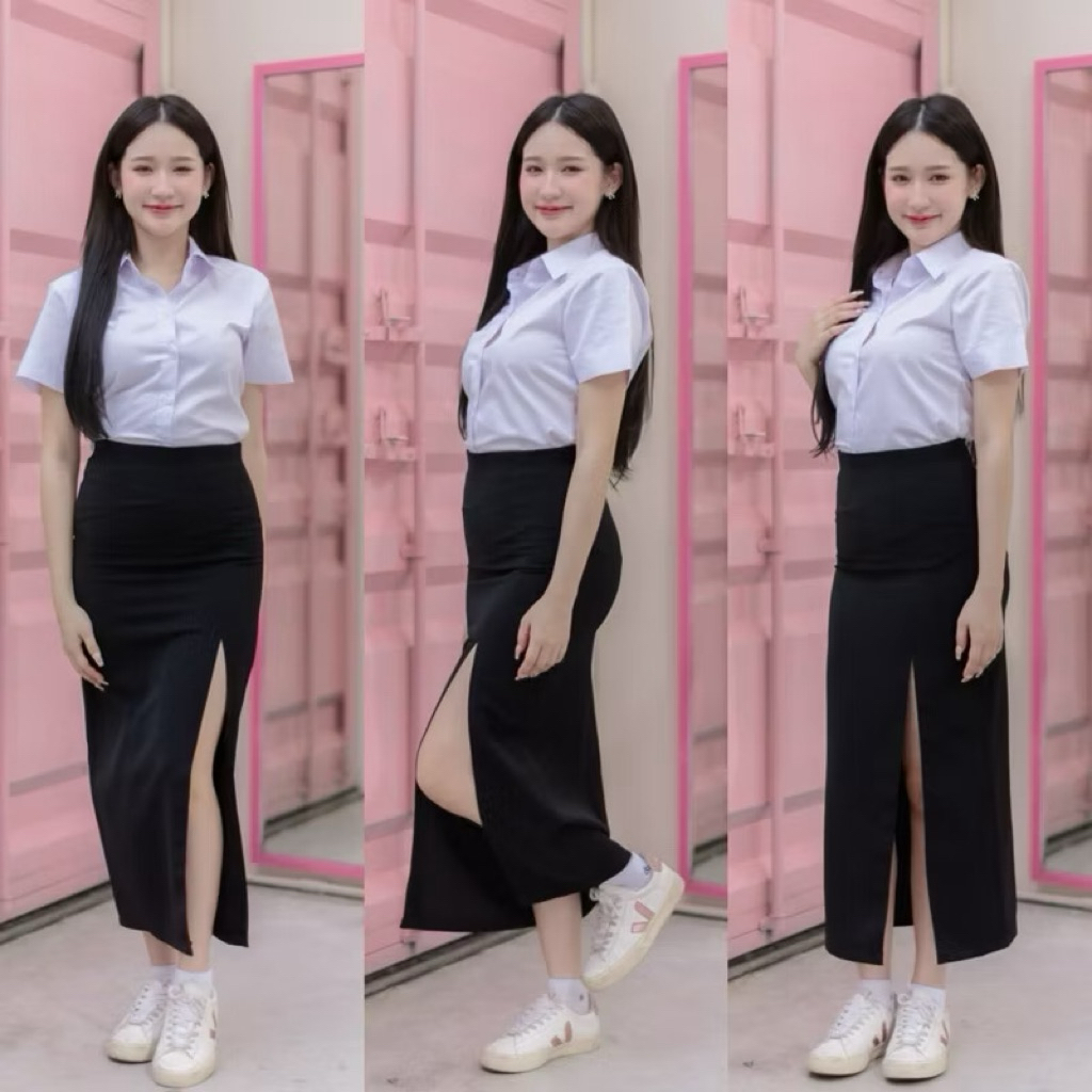 🍭กระโปรงนักศึกษาทรงเอ มียาว32-34-36นิ้ว ผ่าหน้า-ผ่าหลัง ทรงเอยาว ผ้ายืดฮานาโกะสีดำ