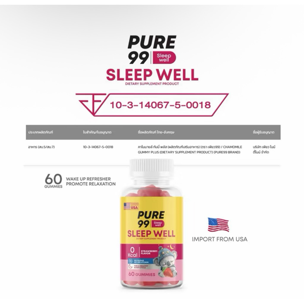 Pure99 sleep well Gummy (60 กัมมี่) ช่วยในการนอนหลับสบาย