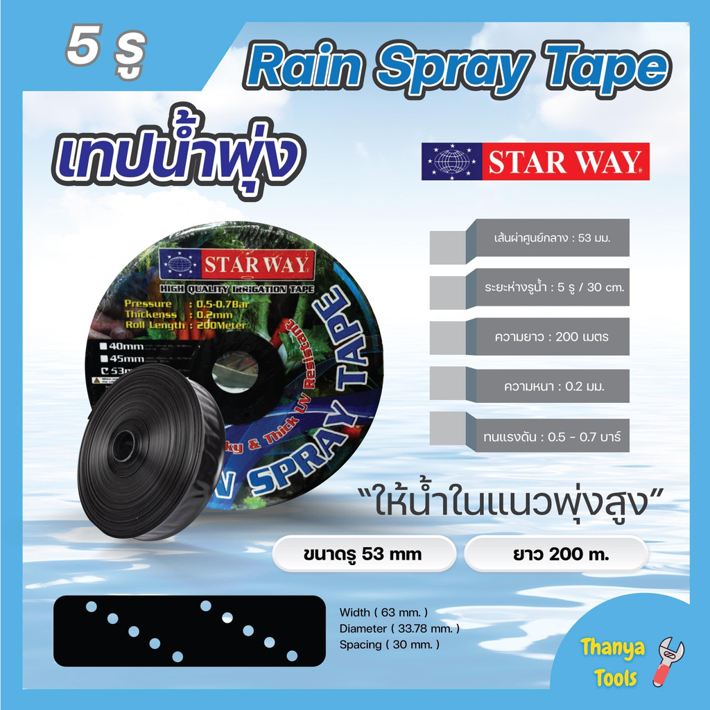 เทปน้ำพุ่ง สายน้ำพุ่ง ระบบน้ำพุ่ง ระยะห่าง 5 รู ขนาดรู 53 มม. ยาว 200 เมตร STARWAY ทนแรงดัน 0.7 บาร์ ยกลัง 5 ม้วน 🏳️🌈🌈