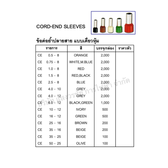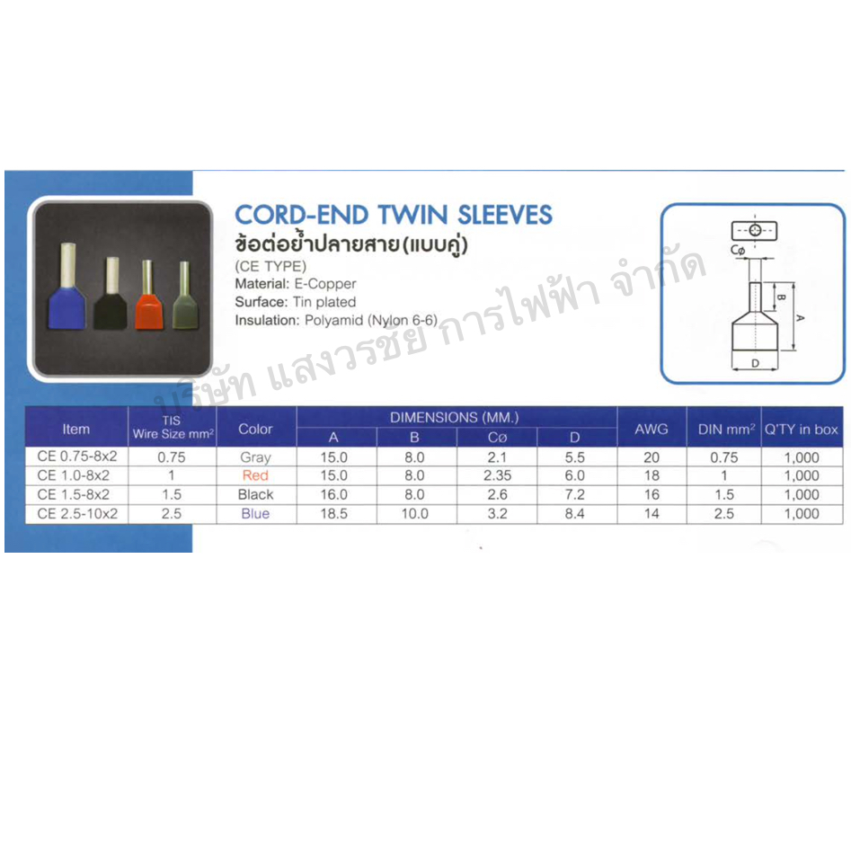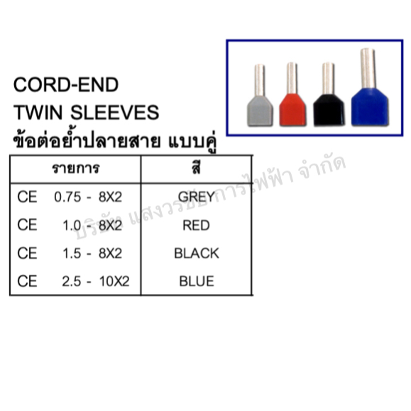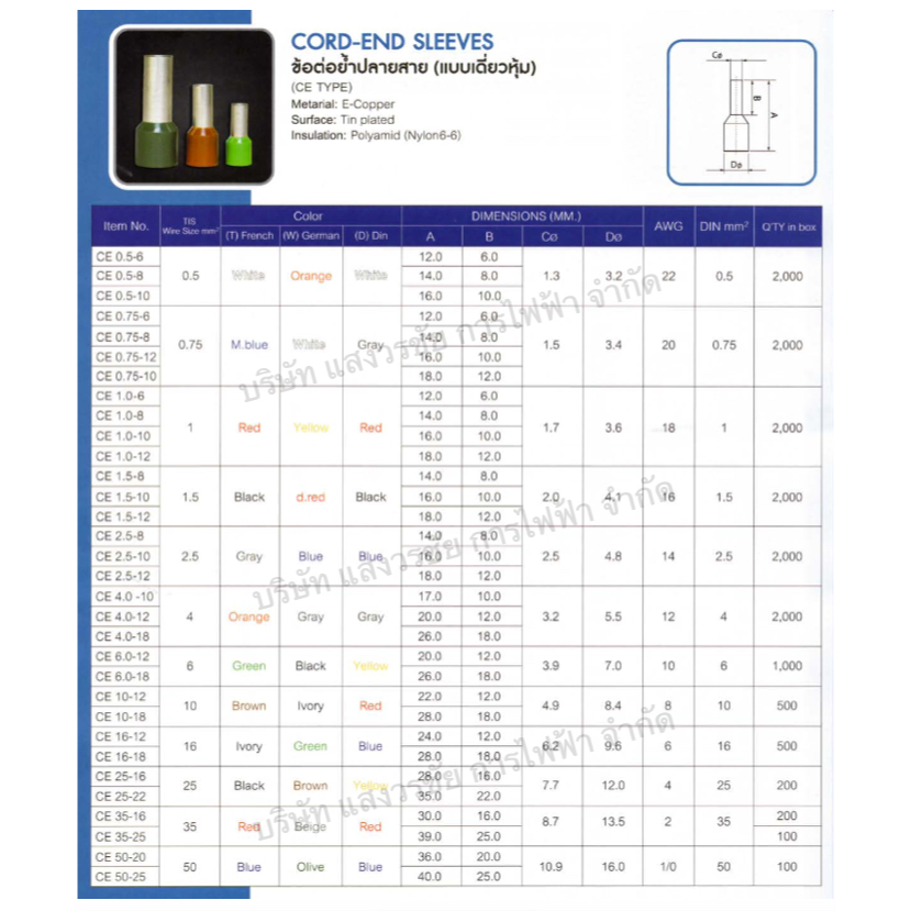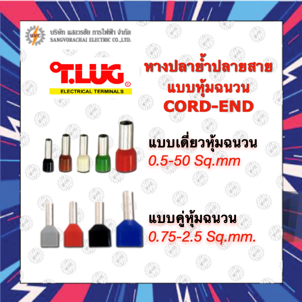 หางปลาย้ำปลายสาย CORD END แบบเดี่ยว แบบคู่ หุ้มฉนวน สีมาตรฐาน ยี่ห้อ TLUG