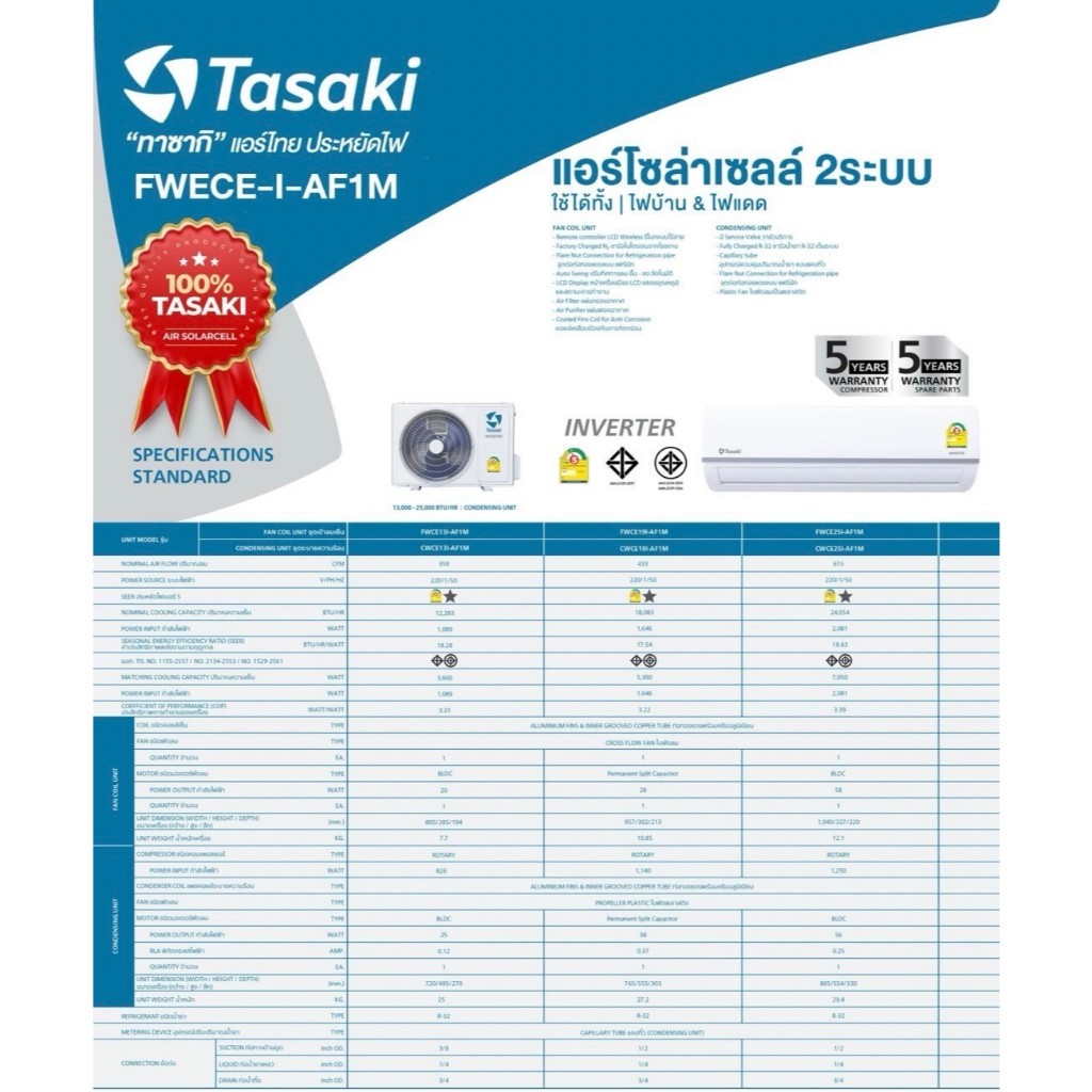 ชุดแอร์โซล่าเซลล์ TASAKI 13,000 BTU **(ไม่รวมค่าเดินทางนอกพื้นที่กทมเเละปริมณฑล)**