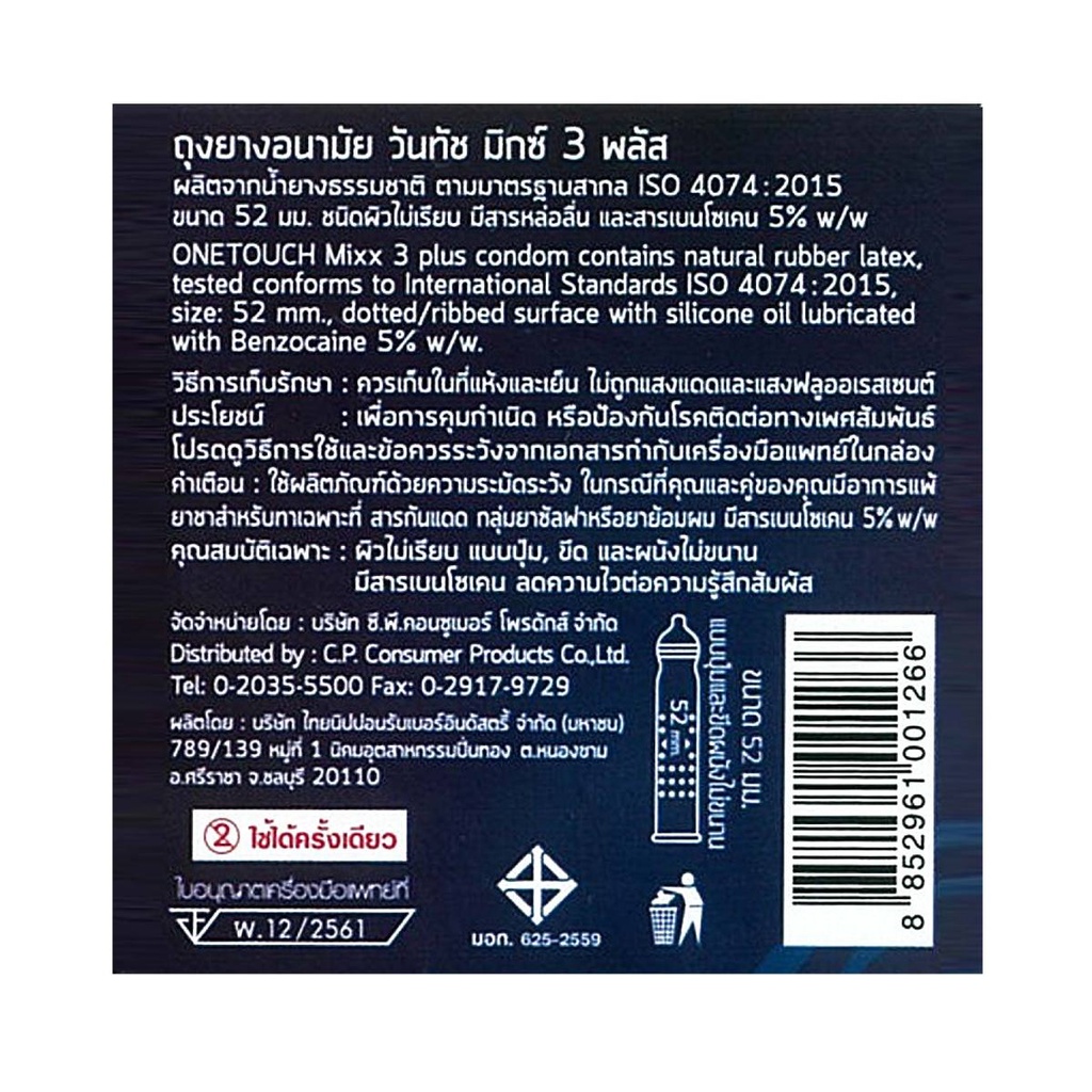 [กล่องใหญ่] ถุงยางอนามัย ONE TOUCH Mix 3 Plus วันทัช มิกซ์ 3 พลัส [10 ชิ้น] แบบปุ่มและขีด 52 มม.