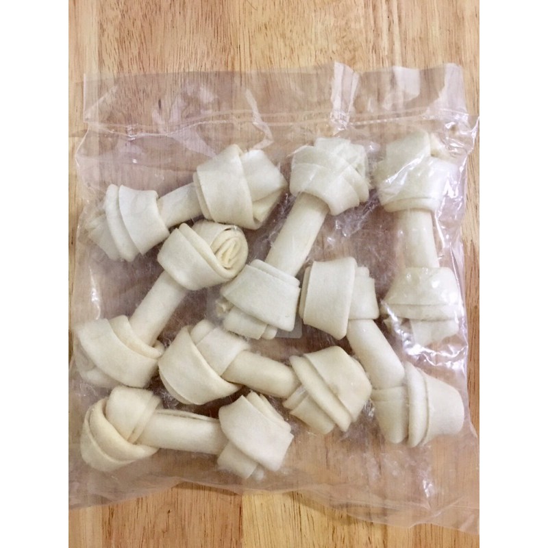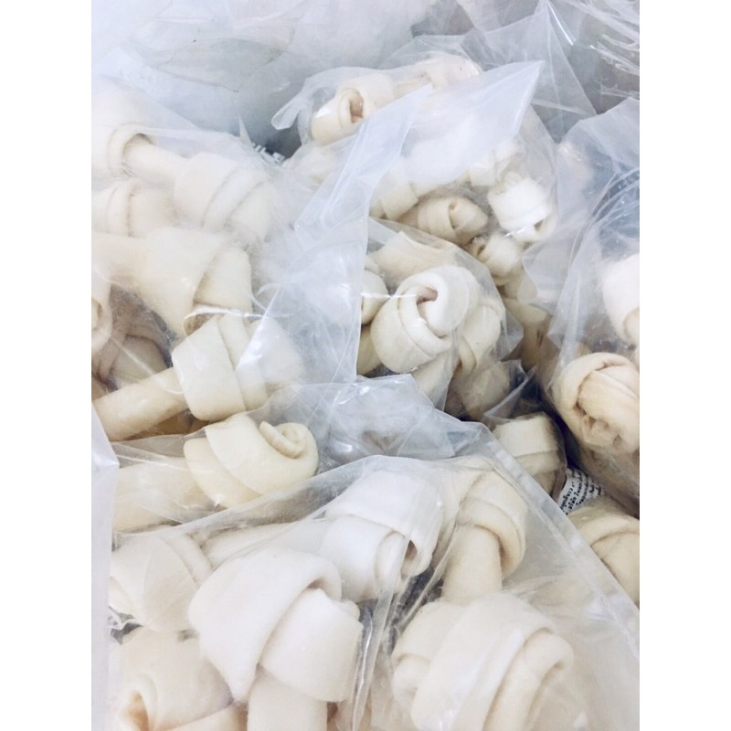 กระดูกผูกขาว ขนาด 2 นิ้ว แบ่งขายถุงละ 100 ก. โดยประมาณ ขนมขบเคี้ยว ยามว่างของน้องหมา