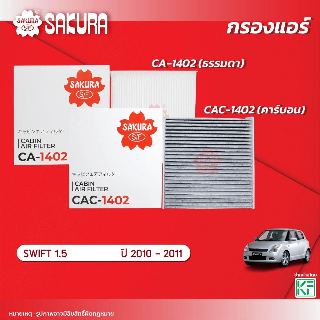 กรองแอร์ซากุระ ยี่ห้อรถ SUZUKI ซูซุกิ / SWIFT สวิฟ เครื่องยนต์ 1.5 ปี 2010-2011 รหัสสินค้า CA-1402/CAC-1402/SFC 62JOOV