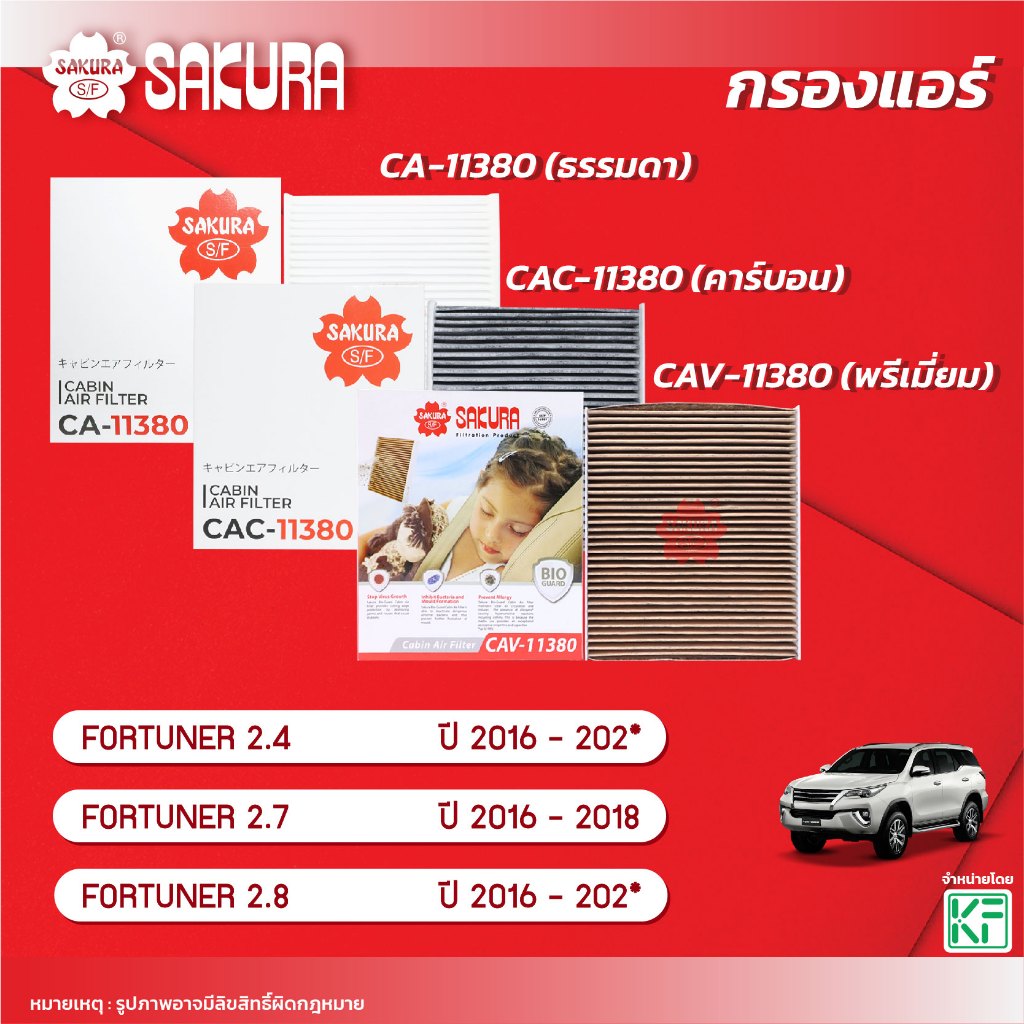 กรองแอร์ซากุระ ยี่ห้อรถ TOYOTA โตโยต้า / FORTUNER ฟอร์จูนเนอร์ 2.4 / 2.7 /2.8 ปี 2016-202* CA-11380/CAC-11380/CAV-11380