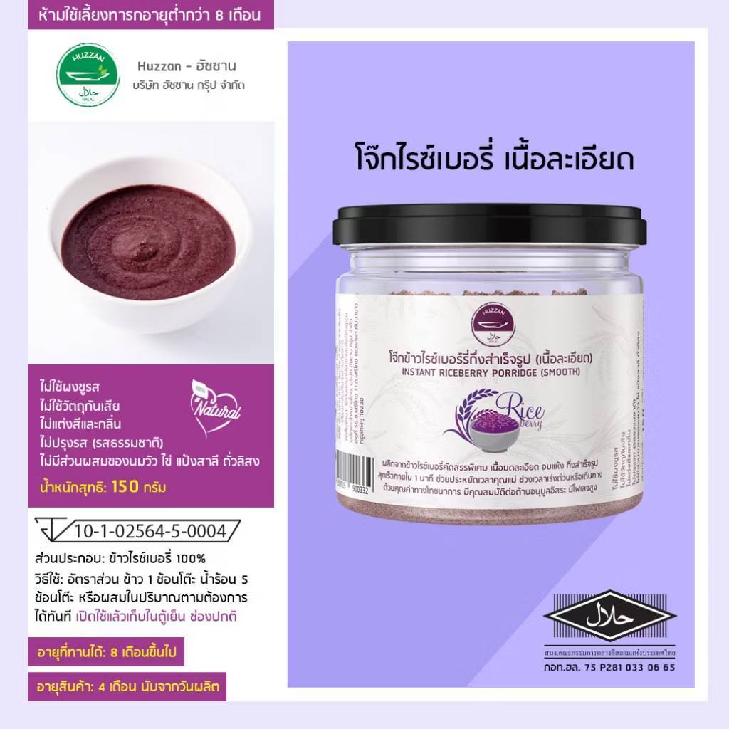 Huzzan 6M+ โจ๊กไรซ์เบอรี่กึ่งสำเร็จรูป ขนาดทดลอง 20g มาตรฐาน อ.ย. Halal อาหารเด็ก 6 เดือน อาหารทารก