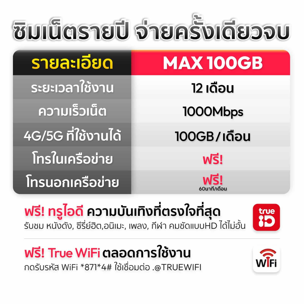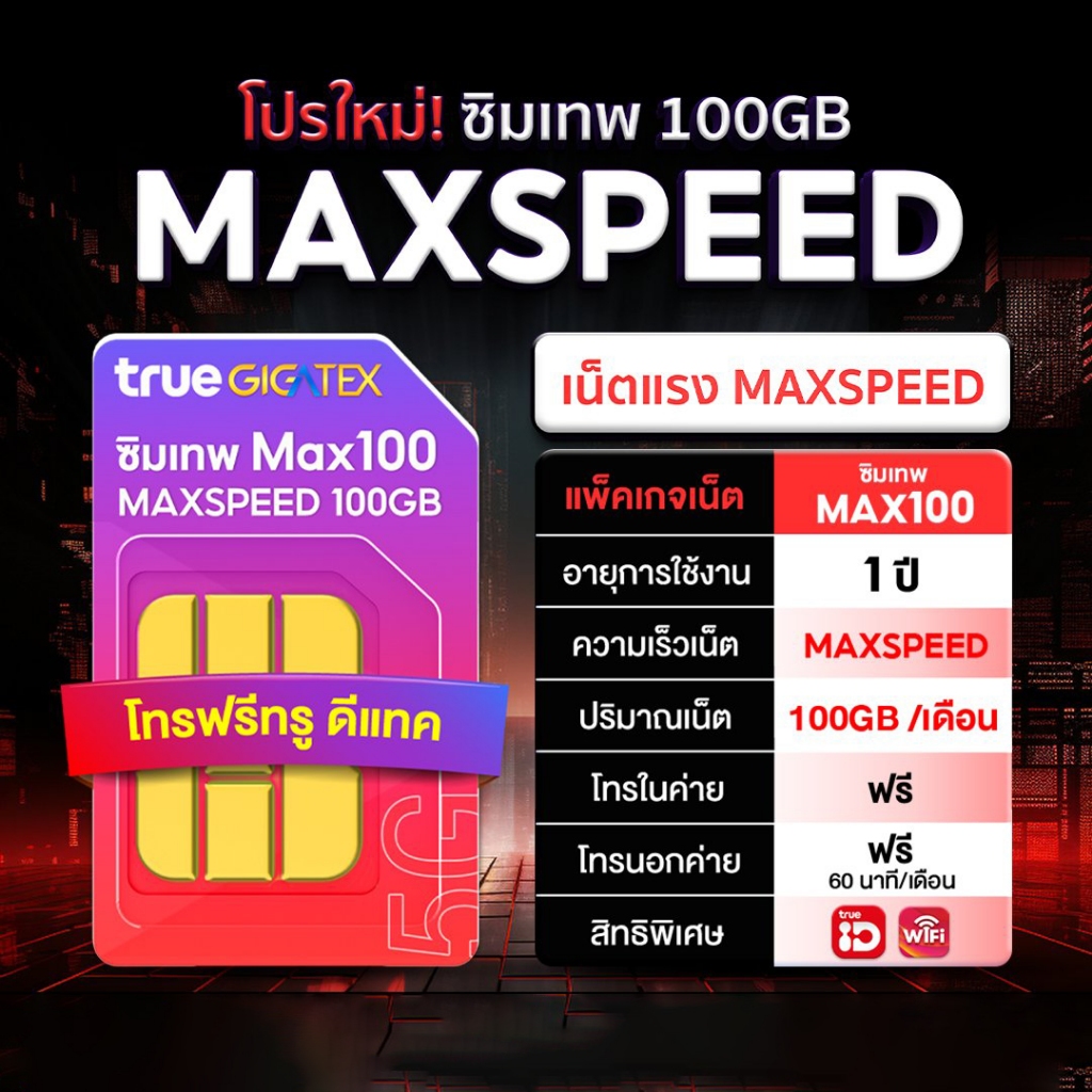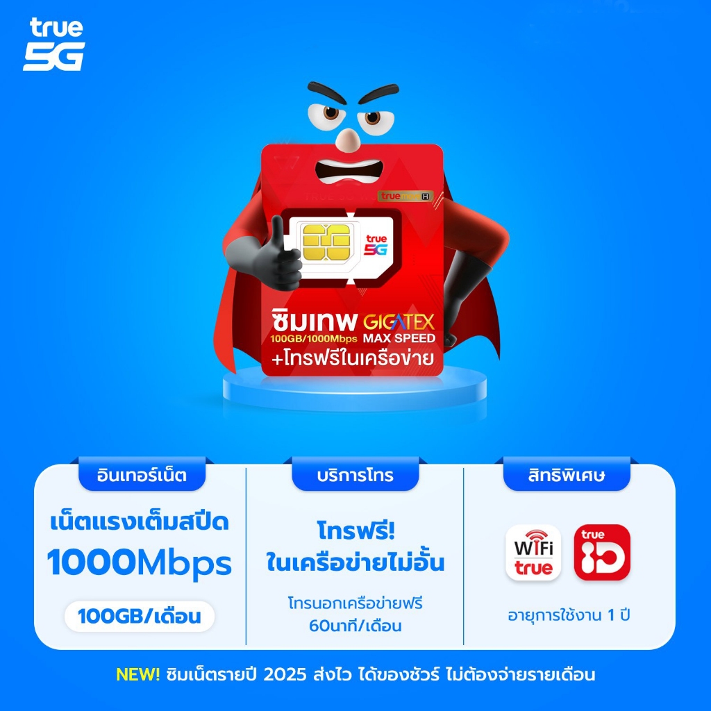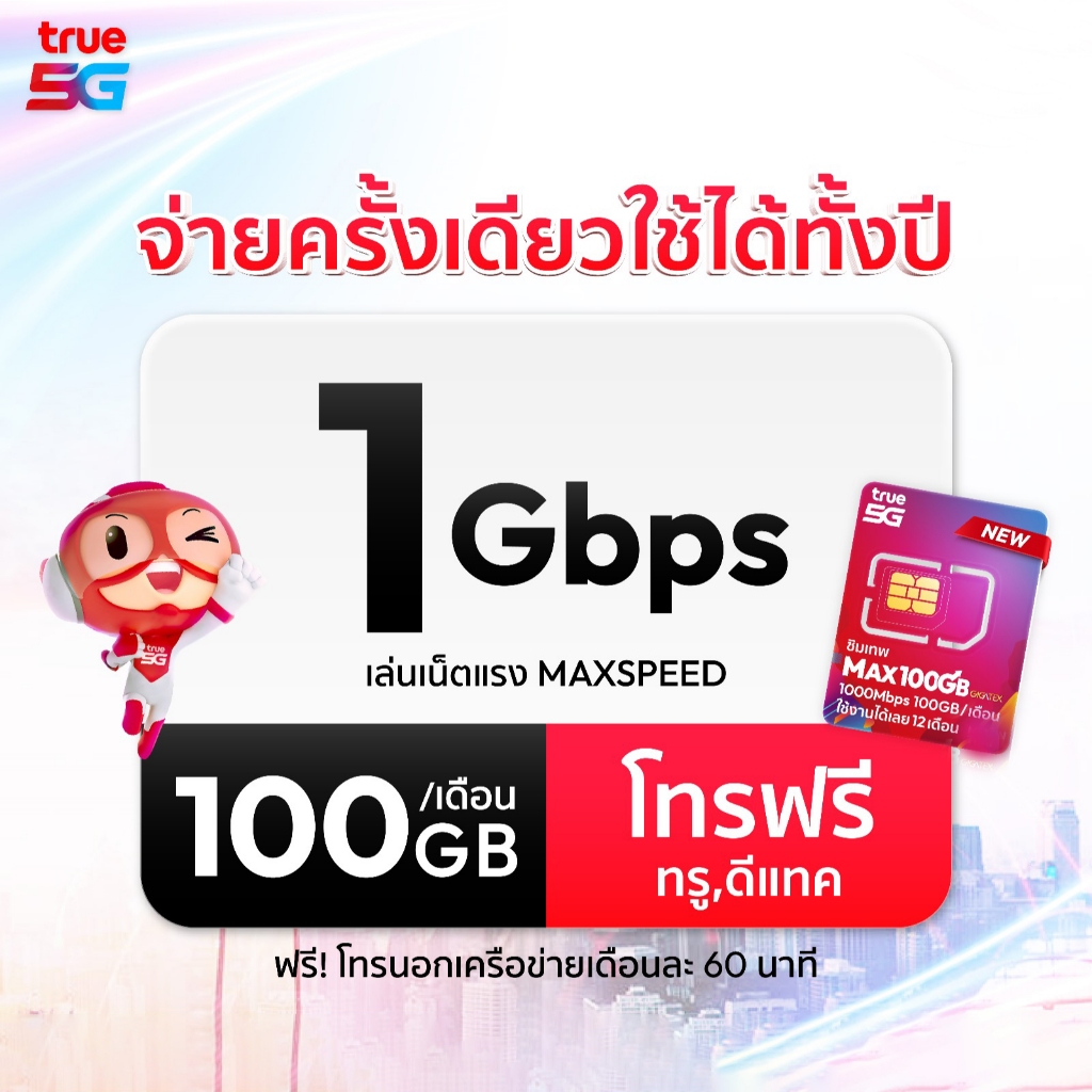 ส่งฟรี ซิมเทพทรู ซิมเน็ตรายปี ซิมเนตแรง 1Gbps 5G MaxSpeed 100GB ต่อเดือน โทรฟรี True Dtac