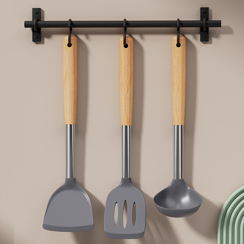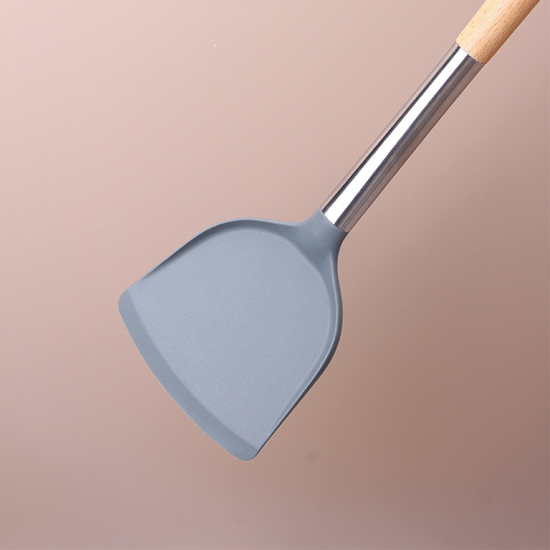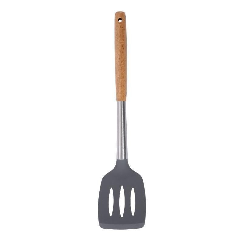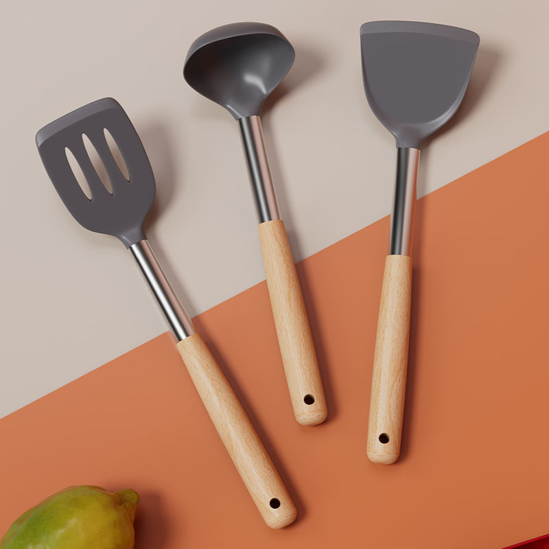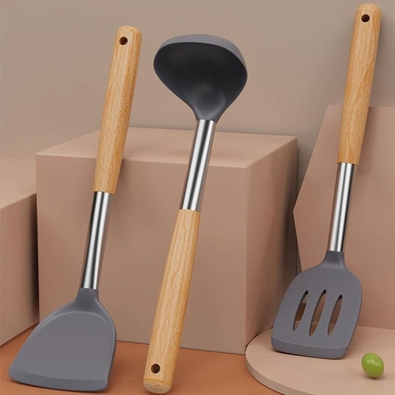 ซิลิโคนไม่ติดกระทะ ตะหลิวทอด ช้อนซุป ตะหลิวสแตนเลสด้ามไม้ เครื่องครัวทนความร้อน