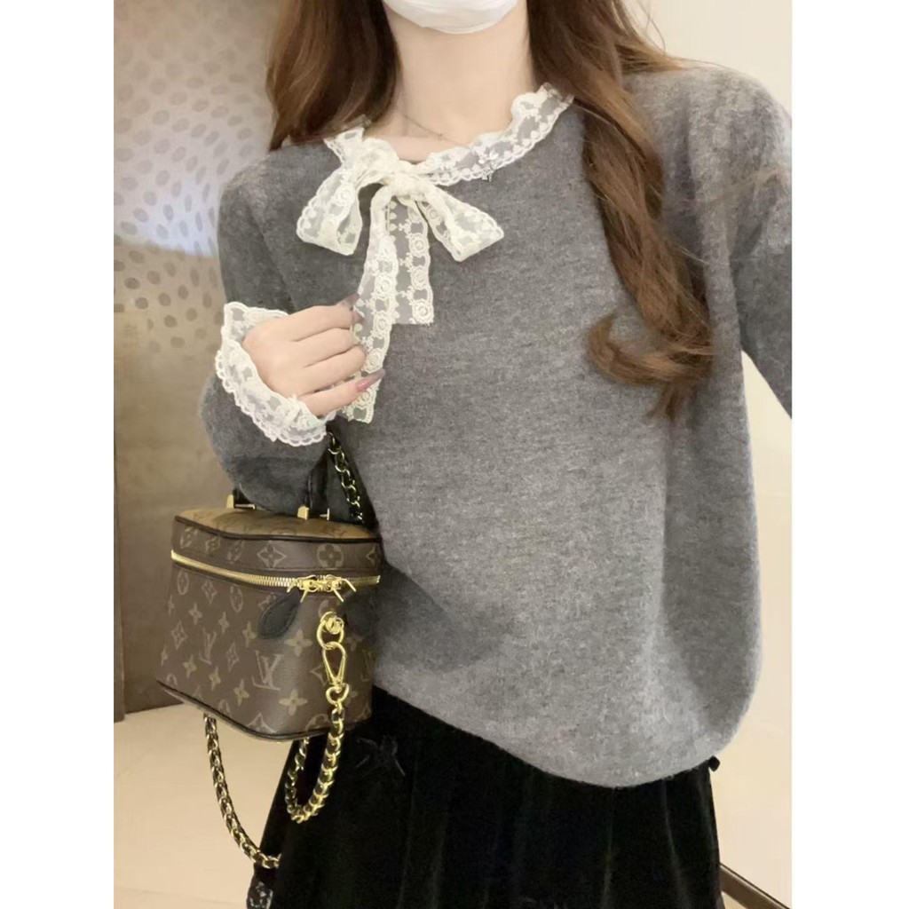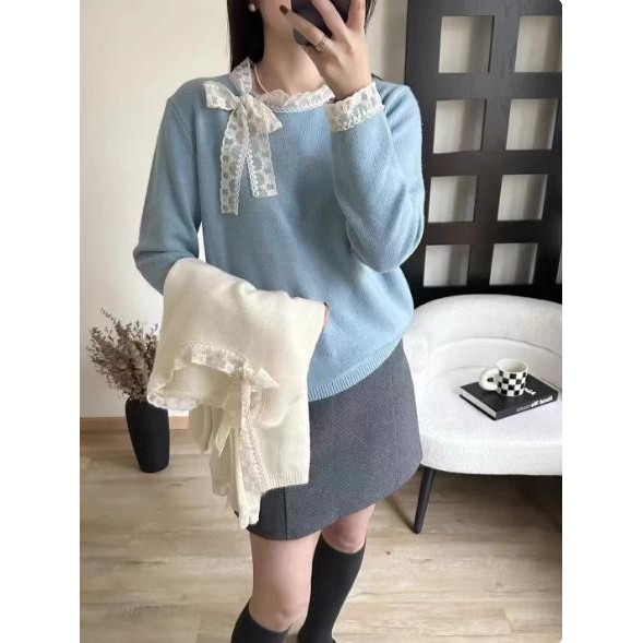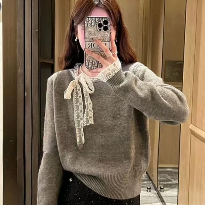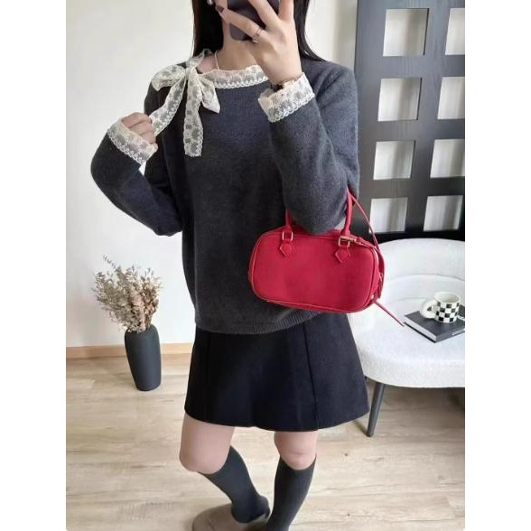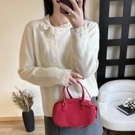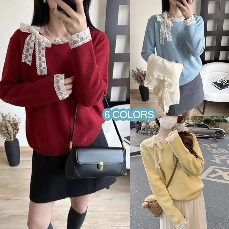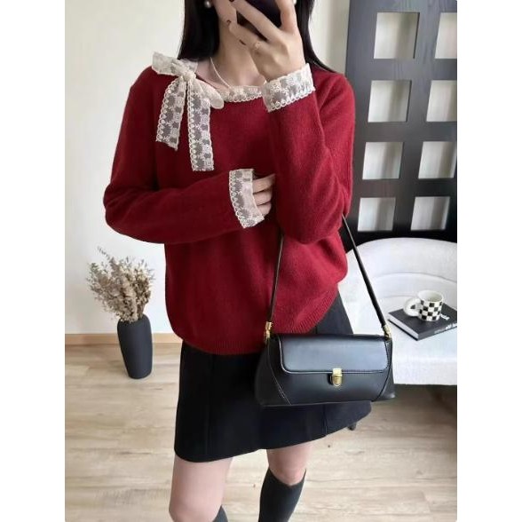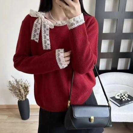 mimi&didi#เสื้อสเวตเตอร์ลูกไม้โบว์เวอร์ชั่นเกาหลีสำหรับผู้หญิง ฤดูใบไม้ร่วงและฤดูหนาวคอกลมแขนยาวถักสีแดง#N108