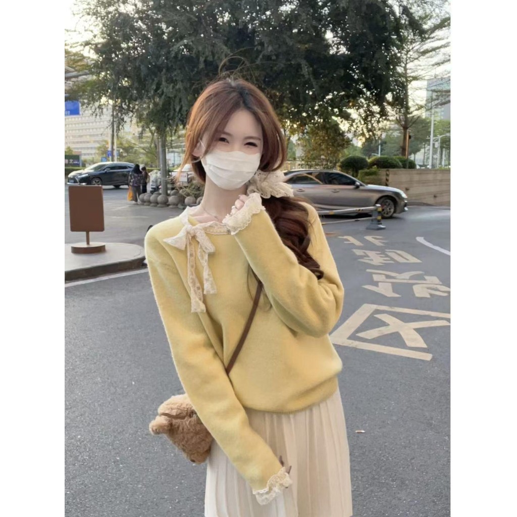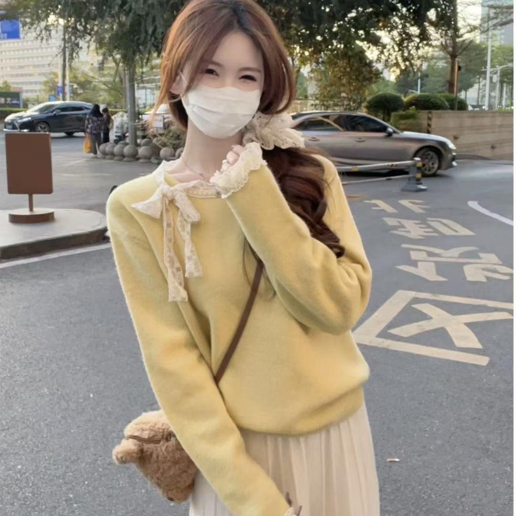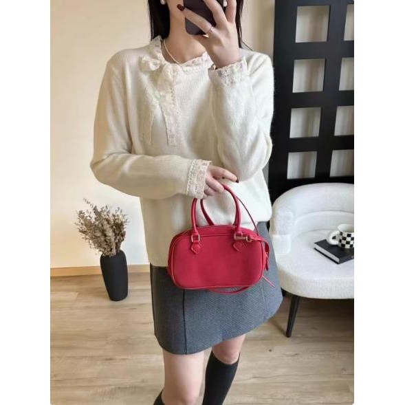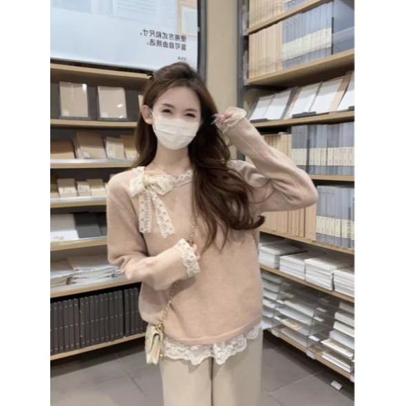 mimi&didi#เสื้อสเวตเตอร์ลูกไม้โบว์เวอร์ชั่นเกาหลีสำหรับผู้หญิง ฤดูใบไม้ร่วงและฤดูหนาวคอกลมแขนยาวถักสีแดง#N108