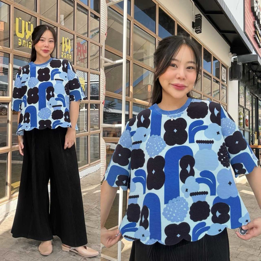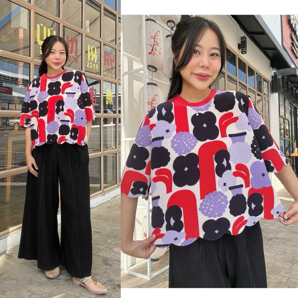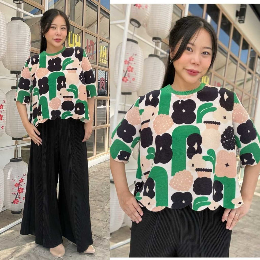 PleatByNisa A956 เสื้ออัดพลีทแขนกระบอก ลายกราฟฟิกสีสันสดใส เนื้อผ้าคุณภาพ Polyester100%