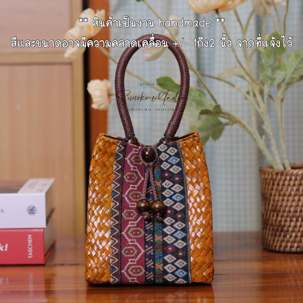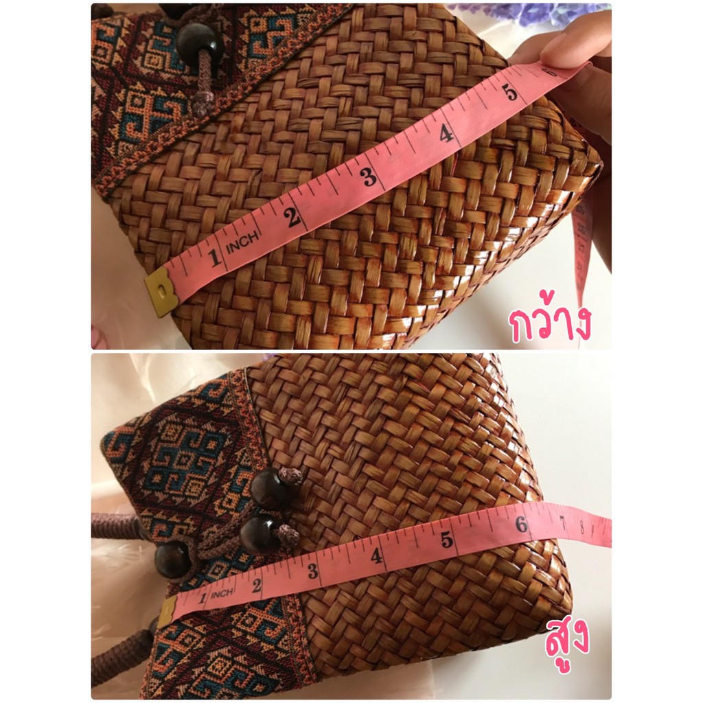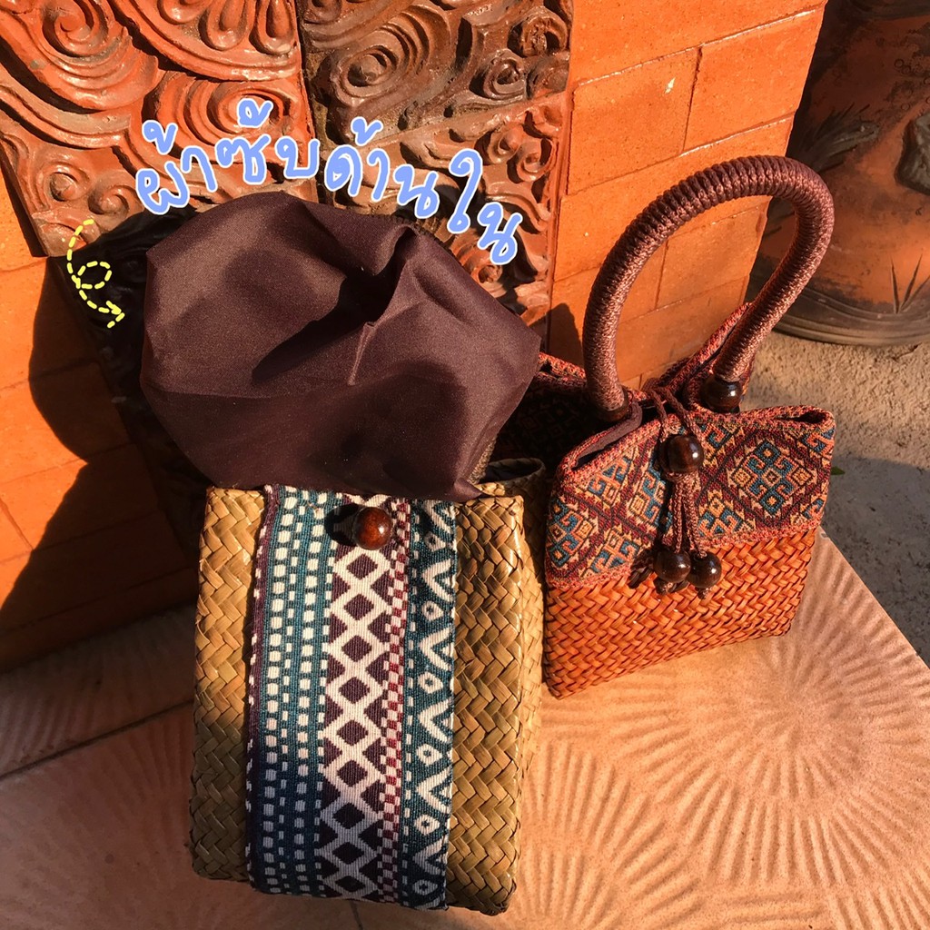 กระเป๋าสานกระจูด เล็ก ทรงจีบ ขนาด 5x6x5 นิ้ว บุผ้าลาย