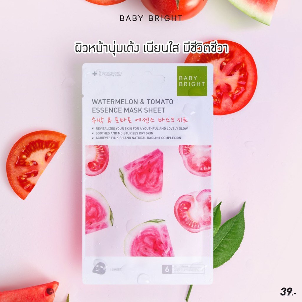 (1 ซอง) เบบี้ไบร์ท มาสก์ชีท Baby Bright Essence Mask Sheet สูตร Watermelon & Tomato Pearl Lemon Pomergranate Cucumber.