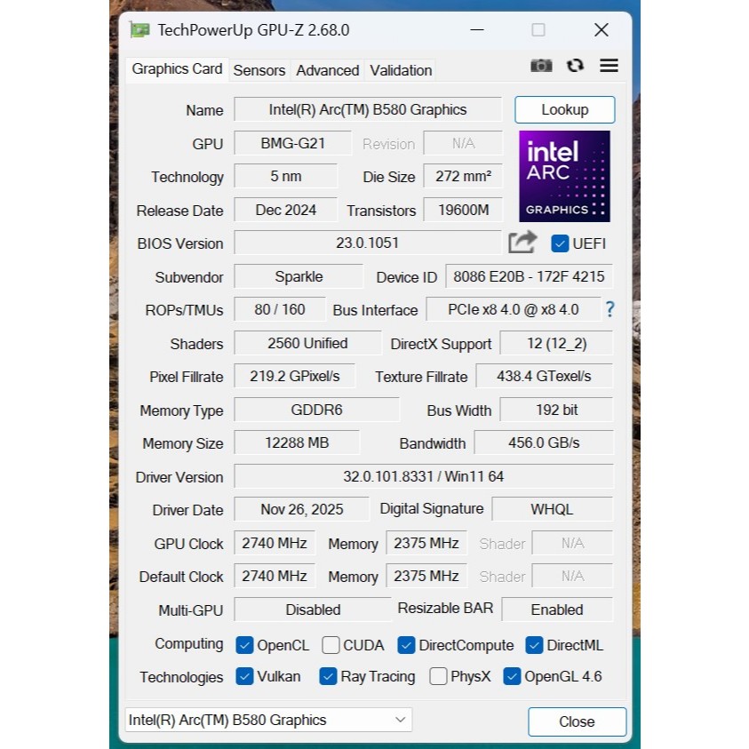 (มือสอง) SPARKLE Arc B580 TITAN OC 12Gb GDDR6 [ประกัน advice 15/10/71]