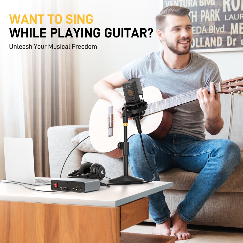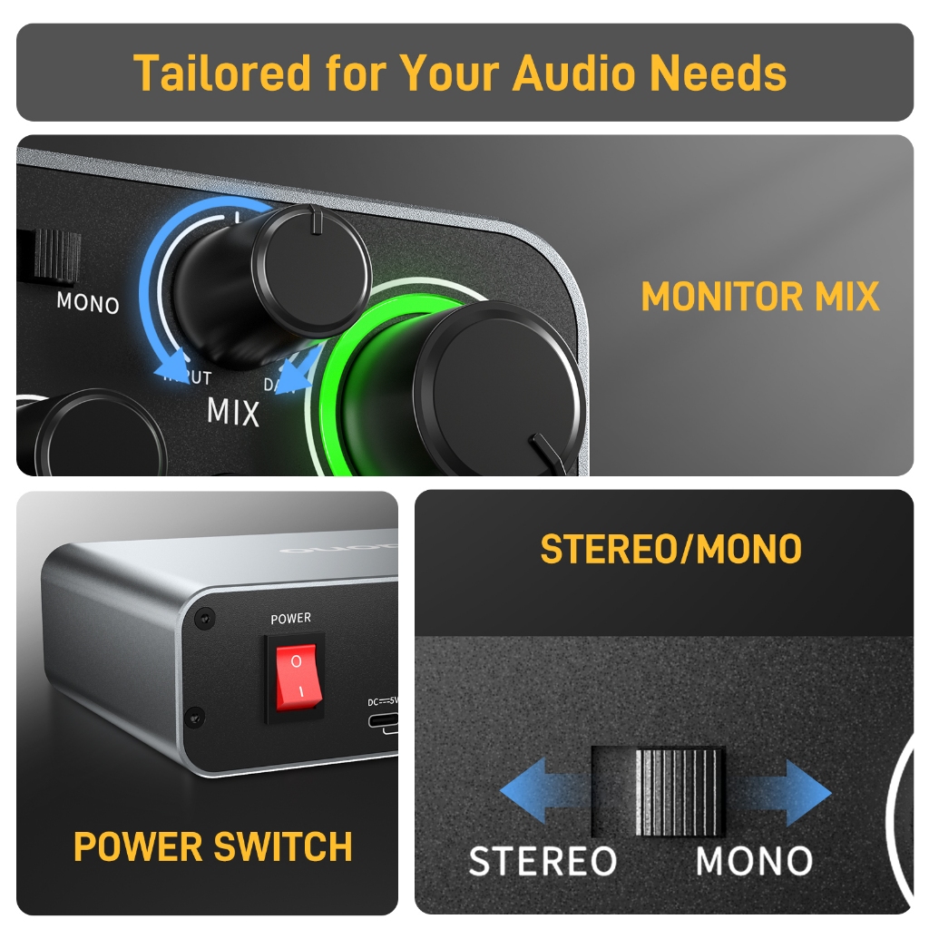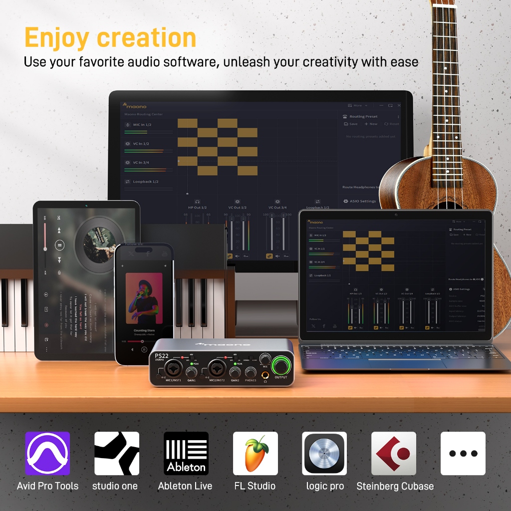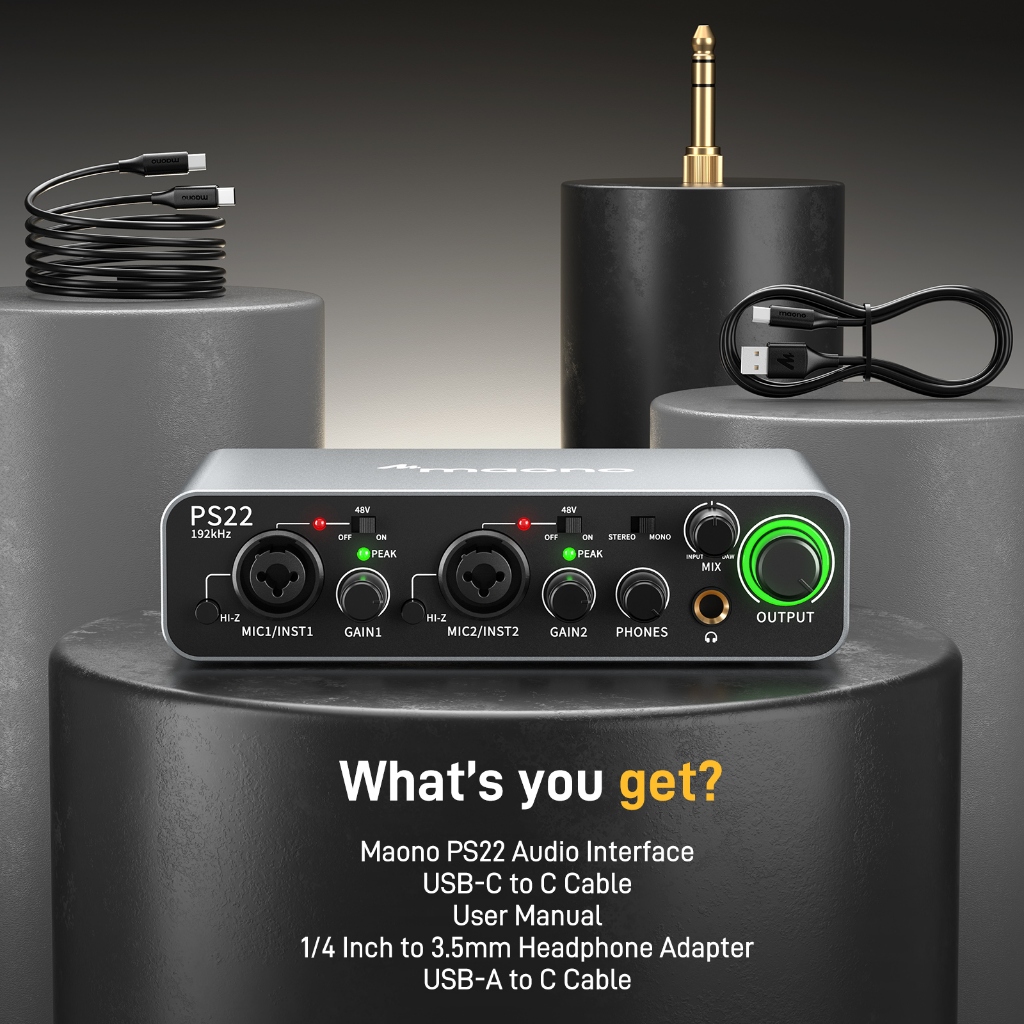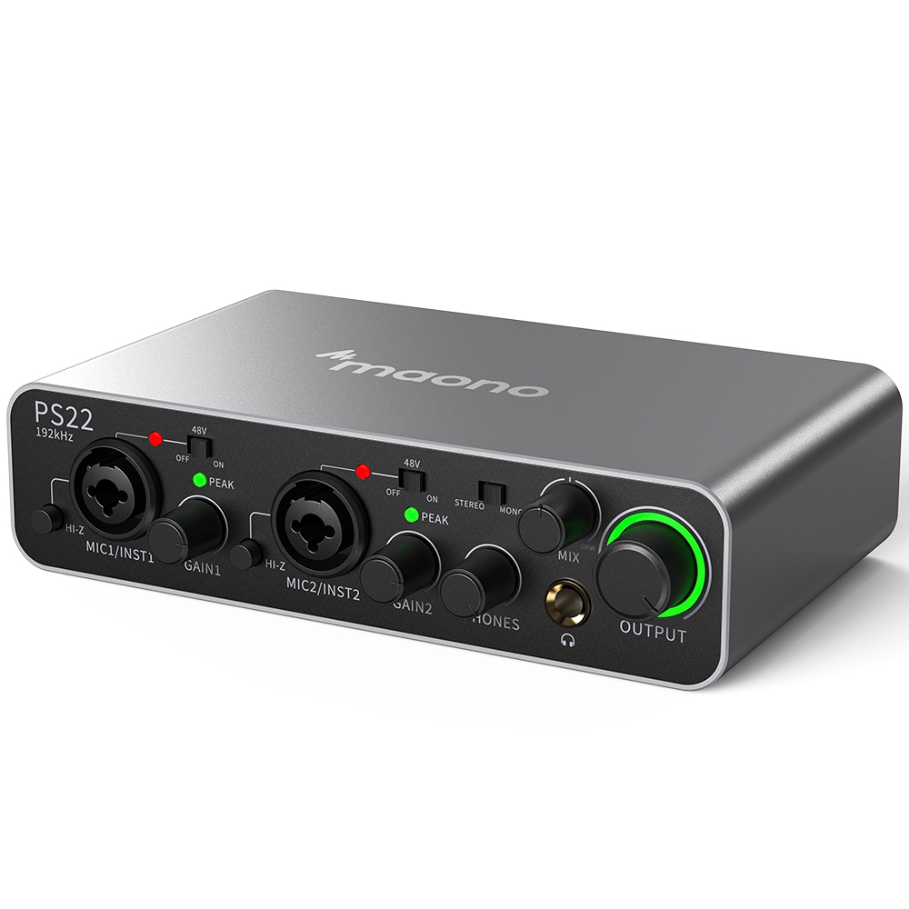 Maono PS22 อินเตอร์เฟซเสียง 24bit 192kHz อินเตอร์เฟซ USB คู่ สําหรับ PC และโทรศัพท์ เครื่องผสมเสียง พร้อมซอฟต์แวร์เร้าติ้ง สตรีมมิ่ง พอดคาสต์ บันทึกเสียงในบ้าน ผลิตเพลง
