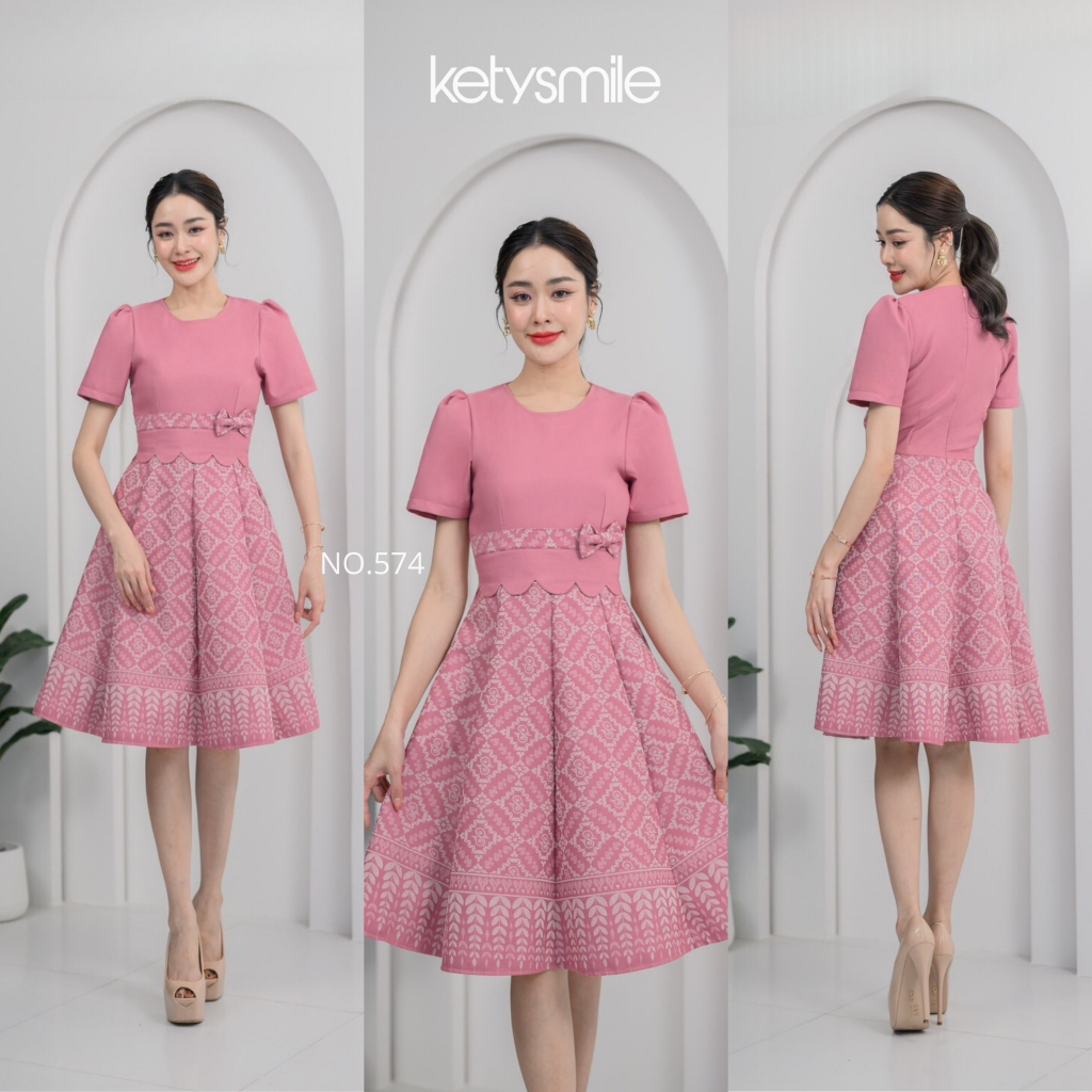 เดรสผ้าทอลายแต่งเอวหยัก แต่งโบว์ ทรงกระโปรงบาน 8 ชิ้น อัดกาวทั้งชุด ซิปซ่อนด้านหลัง (S-2XL) KS574